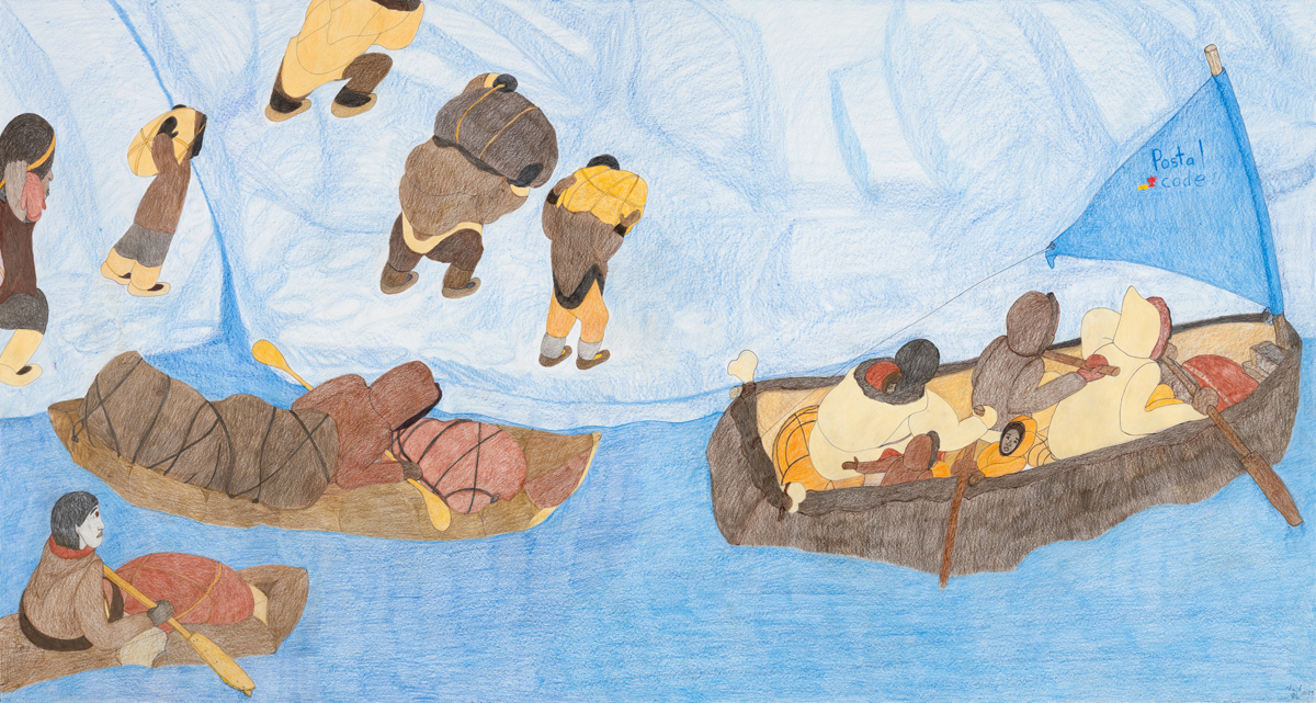 When the New York Times profiled Ashoona last year, it published as its hero image a photo of Kinngait that, not unexpectedly, emphasized its remoteness, vast skyline, eerie, constant twilight, and forbidding climate. When the artist turns to that same landscape in her drawings, the effect is entirely different. Images like Moving with our campsites (traditional movers) and Eggs and Rocks (both 2023) show a place that is not barren but replete. The first portrays a group of people dressed in traditional animal-skin clothing walking over ice floes and rowing kayaks loaded with their belongings. (The coexistence of long-standing cultural traditions and the trappings of modern life is indicated, subtly, by the sail of the leading boat, which is printed with a Canada Post postal code.) The second depicts a snowless expanse of irregular boulders separated by rivulets of pebbles and a pond, with birds swimming, sunbathing, or tucking themselves under and between the stones. In both cases, the horizonless composition confounds the eye. We look down on the scene without exactly having a bird’s-eye view: the landscape seems to project toward us, almost cradling us at some points, destabilizing us at others; it’s not still and frozen but active and roiling. When Ashoona trains her gaze on particularities—as she does, for example, in Eggs and Rocks, where she delineates the pebbles one by one in almost impossible detail—she paradoxically pushes the image toward abstraction. For those of us who have only experienced the Arctic through photographs—and that includes almost all of us, I would think—her eccentric subjects and complex spatial gambits result in images that challenge settler-colonial terms of representation. In these pictures, the North is not empty and therefore free for the taking, but is on the contrary teeming with life, human and otherwise.