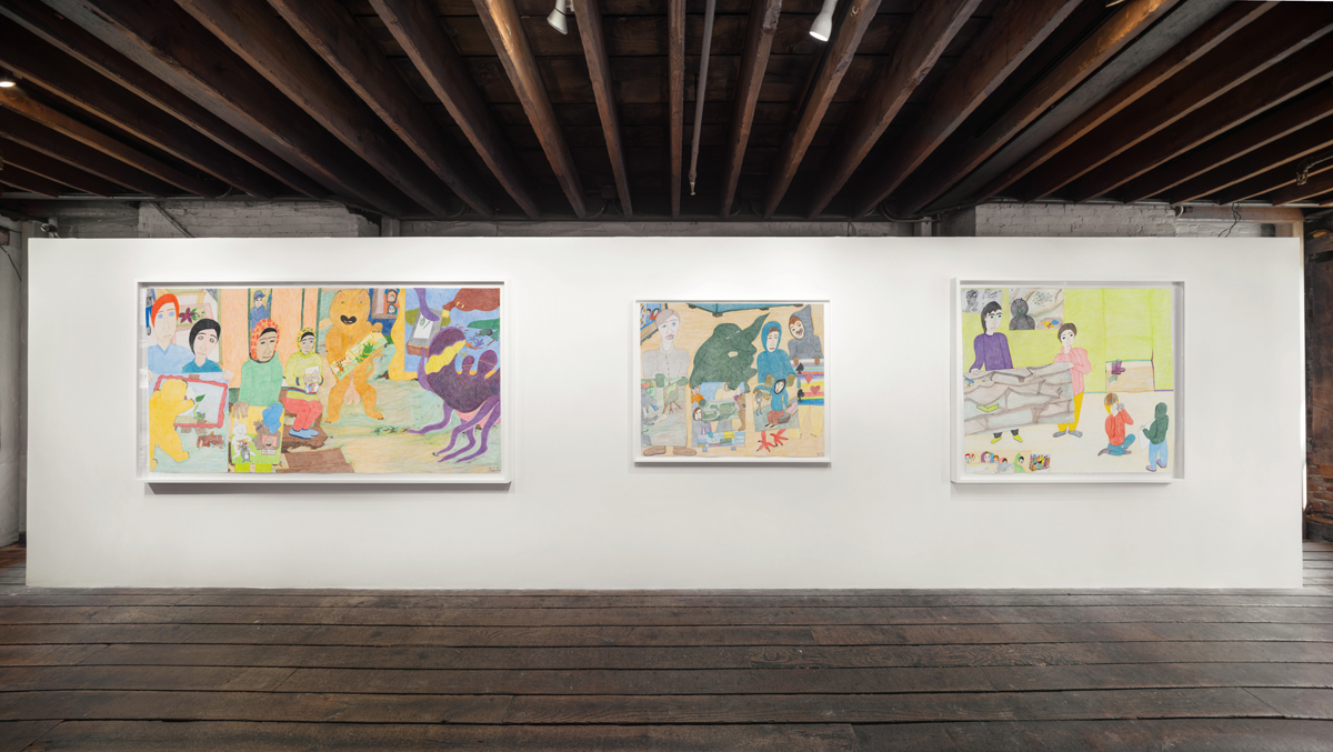 Shuvinai Ashoona: Looking Out, Looking In, installation view. Courtesy the artist and Fort Gansevoort. © Shuvinai Ashoona. Pictured: Made my clothing at clothing centre, 2022–23.