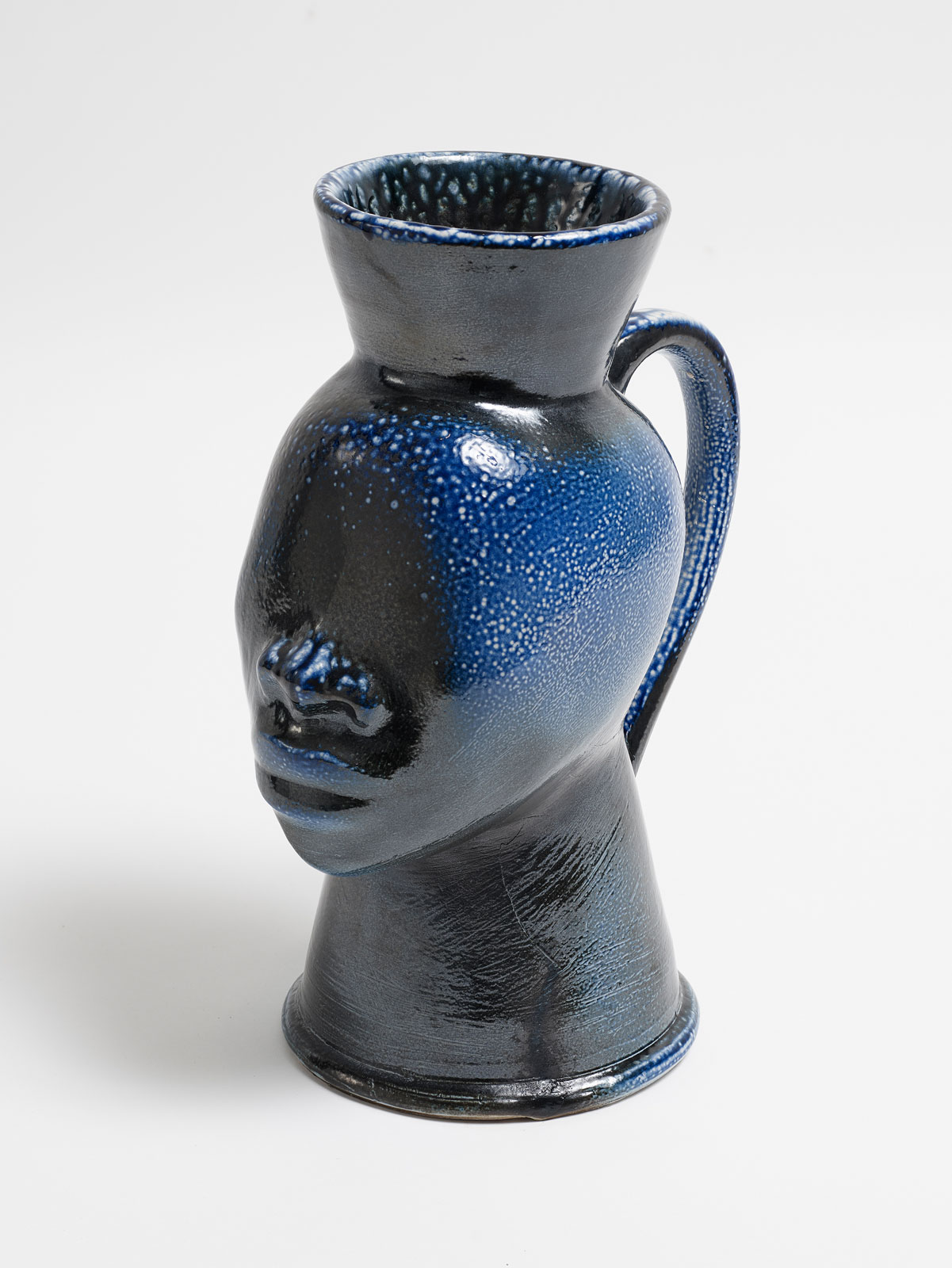 Among the sculptures here (all from 2018) are a number of glazed, salt-fired stoneware “face jugs,” objects that trace their lineage to early African American pottery traditions, and even further back to West African and Greek and Roman classical sculpture. In an interview from 2015, Leigh said that the face jugs of the black diaspora were “made to look ugly to ward off evil spirits,” but if there is ugliness in her versions of the form it is of the most jolie laide variety. Head with Cobalt comprises a head set on a thick neck, with a footed base, a curved handle emerging from the back of its skull, and a flared opening at the top—the latter element turns this object into a vessel, while at the same time functioning as a crown. Its features—the two that it has—are unmistakably African: wide, flat nose and full lips, marks of beauty for some and derision for others. There are no eyes for this face to see, no ears to hear. The pot is glazed black, for the most part, but examine the flared opening and you will notice that the edge and the interior are dappled in milky white and cobalt blue (the result of Leigh’s labor-intensive salt-firing technique); that same white and cobalt is finely spattered over the side of the head and along the edge of the lips. The effect is cosmic—a metaphor, perhaps, for the realms of knowledge and imagination, as plentiful as the stars, that black women have carried with them over generations and across oceans in order to persist and survive, to maintain cultural traditions and ensure community.