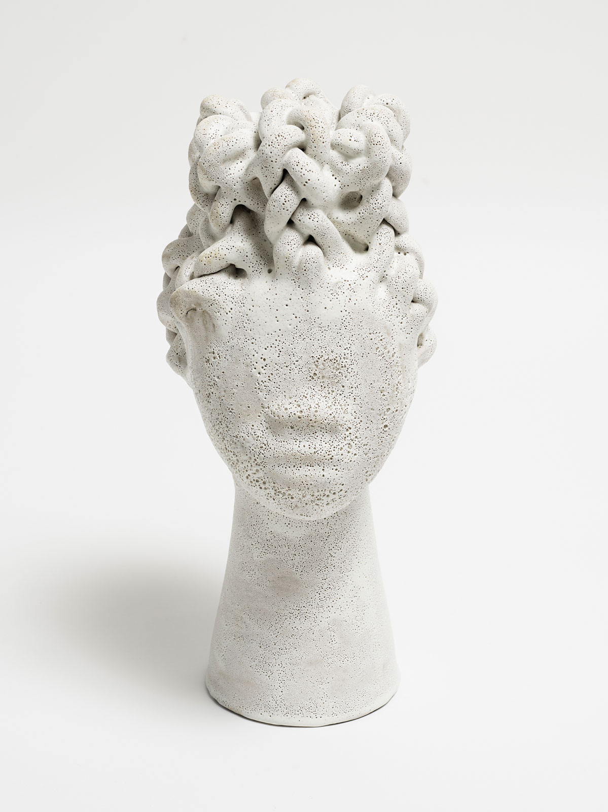 Of the thirteen pieces on view, ten are female busts and bodies, and all but two are ceramic, a material appropriate for their jug- or vase- or container-like forms. No Face (Bronze), placed near the entrance of the first room, is one of the material exceptions. As its title suggests, this smooth ovoid resting on a dark, burnished, columnar neck is made of bronze and has no face. Peer into its hollow head and you will find only a velvety, seductive blackness. A few steps over is No Face (Pannier), the top half of a woman sitting upon a raffia-covered steel armature that functions as the lower half of her body and plinth simultaneously. The woman’s torso, arms akimbo, made from terra-cotta and rubbed to a dull sheen with graphite, is the inverse of No Face (Bronze), in that it replaces the latter’s abstracted, stylized minimalism with a poignant specificity. Cast from a live model, and showing the telltale signs of fingers working clay, the figure communicates both vulnerability and strength—with sagging breasts and wrinkled abdomen and the effects of gravity’s pull around the navel, all arranged in a superhero’s power stance. This resilient body is crowned by a head festooned with small, stylized, porcelain rosebuds in shades of cream, ecru, pale gray, and pale orange. But as with its bronze counterpart, it lacks a face—the chasm of its head contains more blossoms, clinging to the interior like the most enchanting barnacles, or like the crystalline shards that reveal themselves upon cracking open a geode.