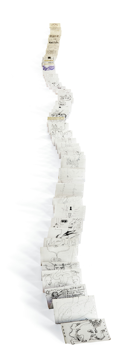 Ted Joans, Long Distance (detail), 1976–2005. Ink and collage on perforated computer paper, dimensions variable. © Ted Joans estate. Courtesy Laura Corsiglia. Photo: Joseph Wilhelm / Meridian Fine Art.
