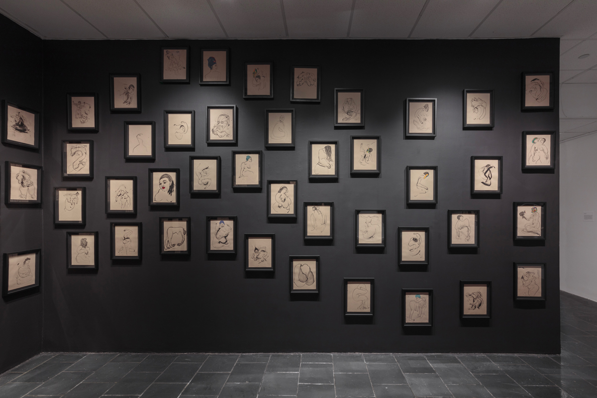 The care that emanates from Henry’s approach—a care that is as much about the sensitive treatment of her materials as it is about the abstracted figures she’s depicting—is also evident in one of the most stunning pieces in the show, Kenyatta A.C. Hinkle’s The Evanesced: The Untouchables (2020), a hundred India ink and watercolor drawings of women. The series grows out of a larger body of work Hinkle has been making since 2016 in honor of the countless number of Black women who have been murdered, trafficked, abused, or disappeared around the world. The Untouchables adds to this community of lost souls those who have died in the COVID epidemic. The artist refers to the pictures as unportraits—stand-ins for, perhaps, or representatives of a larger community of women whose lives were treated as disposable. Decidedly nonmimetic in form, Hinkle’s drawings function as homages, but also as conduits for the power, energy, and vitality of the lives that were lost. Some of her subjects have two heads, others seem to drip eyes from their full breasts, still others float or fly or smile or mourn. The artist renders the lines quickly, using brushes she makes herself—the ritual of crafting her tools is part of the way she pays tribute to her subjects—and, because they are in ink, once they are put down on paper they are fixed. In a world that wants to efface Black women, Hinkle’s work seems to brook no possibility of erasure. The Evanesced creates a kind of counter-index: while organized by an overarching category (women who have been murdered, abused, etc.), its subjects resist categorization. Like the other artists in this exhibition, Hinkle offers up Black life, acknowledging but defiantly resisting white supremacy’s archives of Black pain, violence, and death.