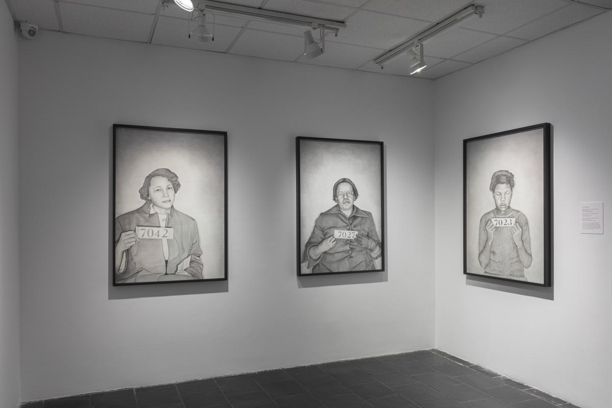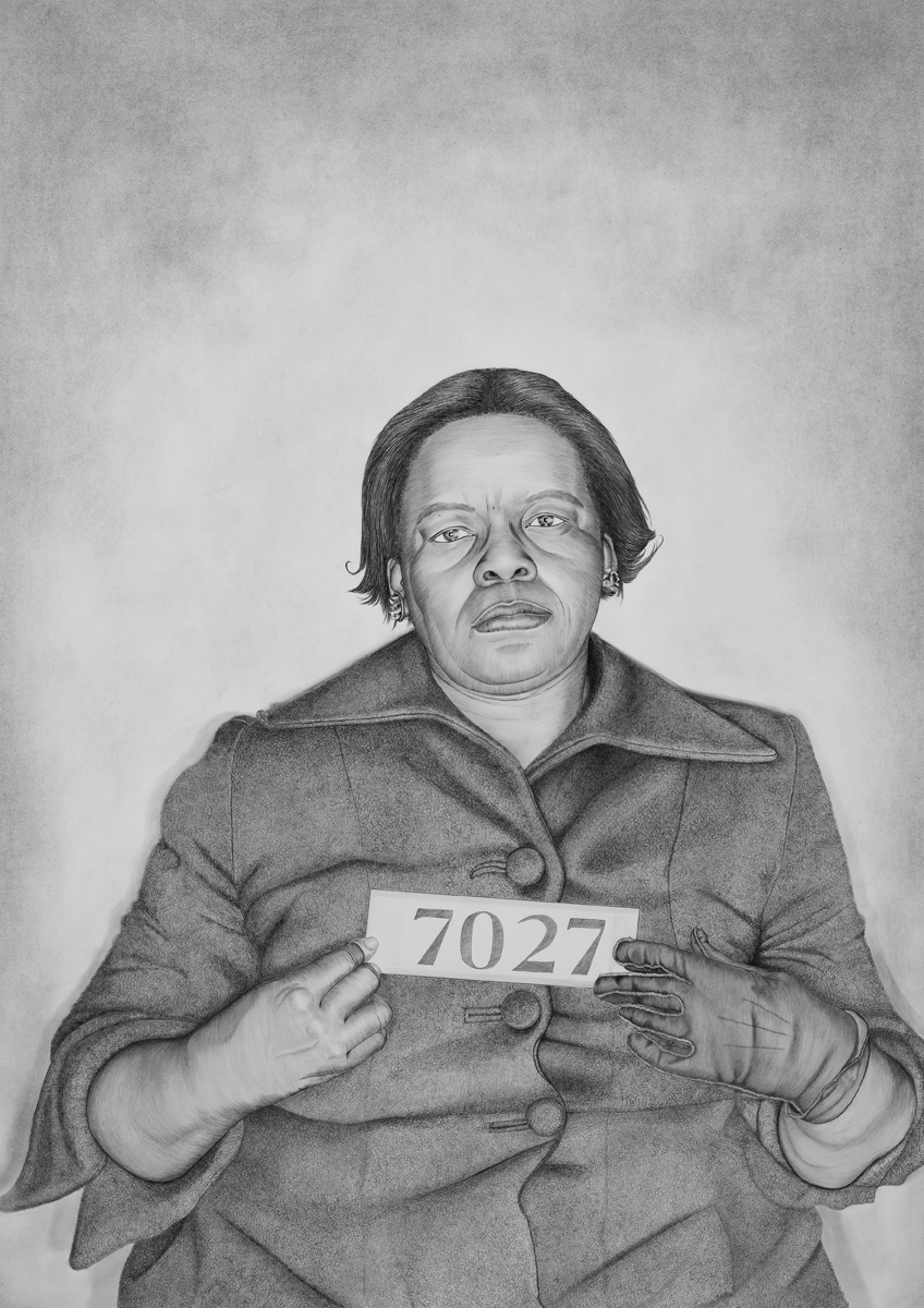 Lava Thomas, Mugshot Portraits: Women of the Montgomery Bus Boycott, Alberta J. James, 2018. Graphite and conté pencil on paper, 47 × 33 1/4 inches. Courtesy the artist and Rena Bransten Gallery. Photo: Phillip Maisel.