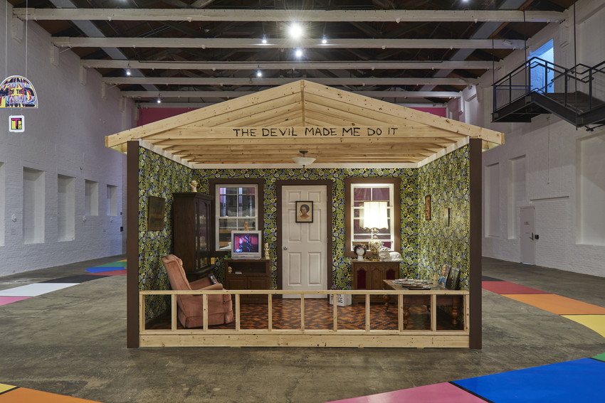 The first structure you encounter is not a Mound per se, but a recreation of Hancock’s grandmother’s house. (This is a classic hero backstory setup; we’re being introduced to the forces that shaped the artist. Best to pay attention.) On the front walk of the white-picket fenced yard are three child-sized figures dressed in Halloween costumes, looking eerily blank-eyed; projecting from the front door, a disembodied arm wielding a protective cross warns them away. Stroll around the back of this movie-set-like structure and you’ll see the living room, filled with an old lady’s collection of cutesy, white bisque Precious Moments figurines sporting labels like “The devil made me do it,” old copies of Jet magazine, LPs of Mahalia Jackson and Richard and Patti Roberts (the son and then-daughter-in-law of preacher Oral Roberts), and, on a vintage TV, a looped clip reel of 1970s televangelists discussing the demonic influence of Dungeons and Dragons on today’s youth.