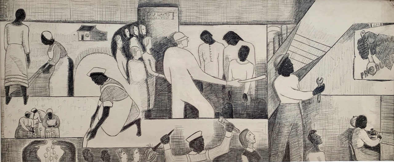 Thelma Johnson Streat, The Negro in Professional Life—Mural Study Featuring Women in the Workplace, 1944. Ink and graphite on paper, 12 1/2 × 30 inches. Image courtesy Bernard Friedman collection.