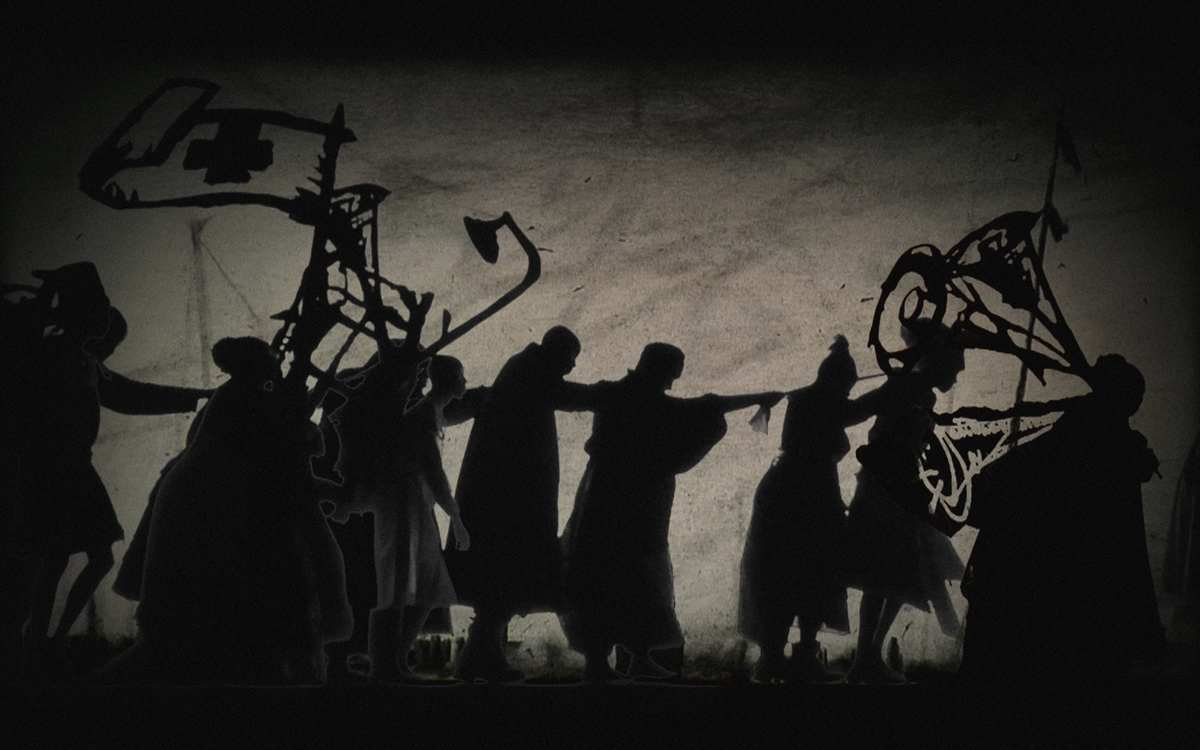 William Kentridge, Kaboom!, 2017–18. Three-channel HD film installation with model stage, paper props, found objects, and three mini-projectors with stands. Courtesy the Broad.