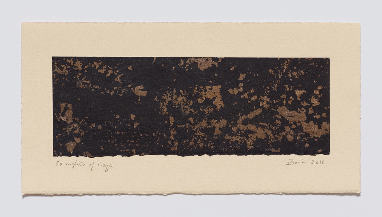 Zarina, 50 Nights of Gaza, 2016. Collage with pewter leaf and BFK light paper stained with Sumi ink, 4.25 × 11.5 inches. Image courtesy the artist.
