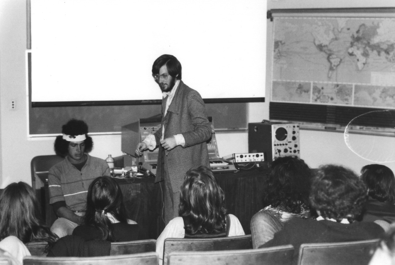 David Rosenboom giving a demonstration of biomusic at Mills College in 1971. Photographer unknown. Image courtesy Black Truffle.
