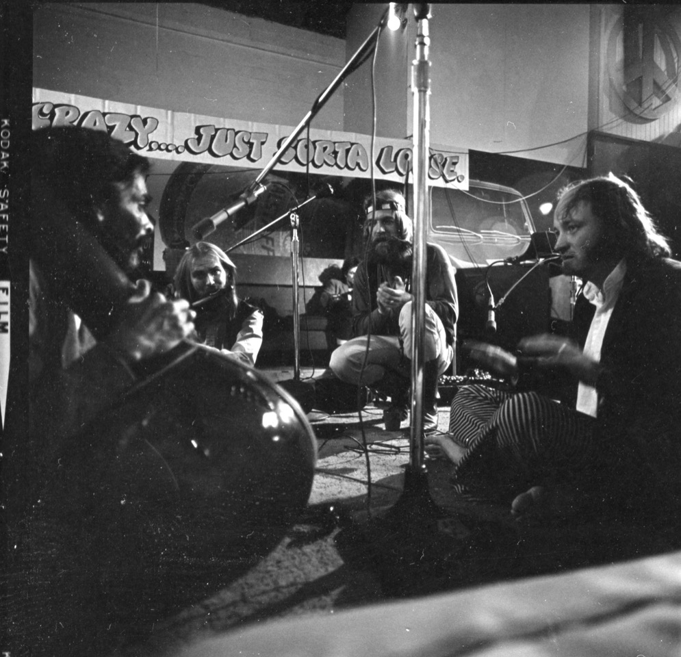 Harish (Hanuman the Monkey God), Dan Errkla, Doug McKechnie, and Terry Riley at the San Francisco Radical Laboratories, 1968. Photo: John Pierce. Image courtesy Doug McKechnie.