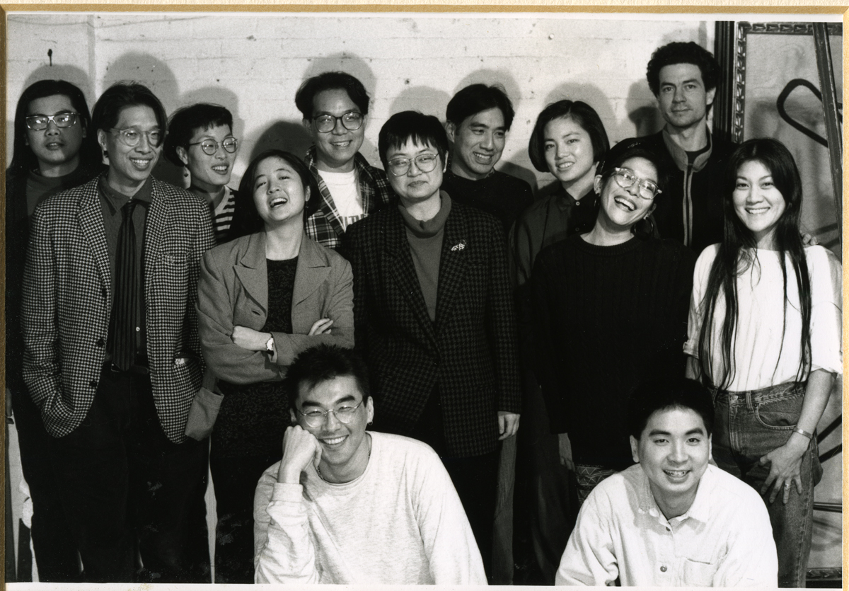 Group portrait of the members of Godzilla: Asian American Arts Network, taken in 1991 for the cover of Godzilla Newsletter 1, no. 1 (Spring 1991). Back row (L–R): Byron Kim, Bing Lee, Eugenie Tsai, Karin Higa, Arlan Huang, Margo Machida, Charles Yuen, Janet Lin, Helen Oji, Colin Lee, Tomie Arai. Front row (L–R): Ken Chu, Garson Yu. Photo by Tom Finkelpearl. Courtesy Tomie Arai.