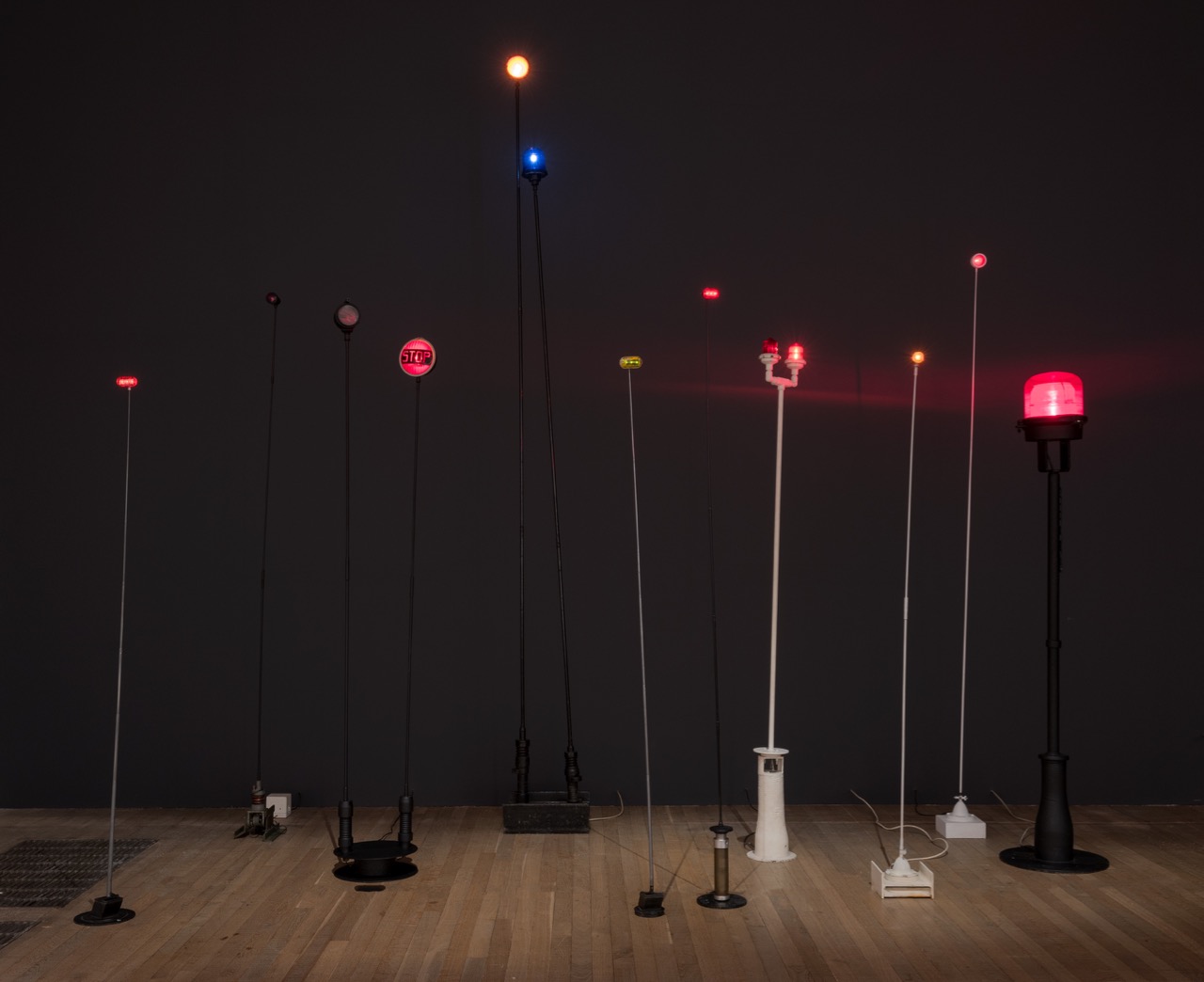 In a way, the pieces are alive, animated by electricity, or by the invisible forces of magnetism, or by equally invisible audio signals. Sound is a core component of many of Takis’s sculptures, even when it isn’t immediately palpable. Like the early electronic music composers in the 1950s, many of whom built or hacked their own custom creations, Takis culled many of his materials—switches, motors, electrical wiring, iron—from military surplus junk and from radio shops. In Signals, a series of sculptures begun in 1955 that sprout from the ground like spiky metal bouquets, the delicately trembling rods have a complex sonic ancestry: many of them were originally radio antennae from military vehicles. Black Panel Dials (1968) resembles the front of a modular synthesizer, with a cool array of flashing lights, but it was repurposed from sinister wartime technology (a helpful placard states that the piece contains radium, but that it is entirely harmless).