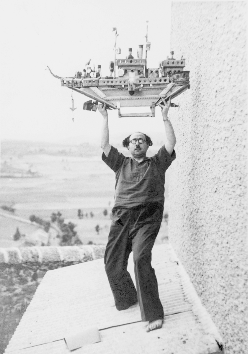 Romain Vigouroux, Francesc Tosquelles on the Roof of a Building at the Saint-Alban Psychiatric Hospital, Holding a Sculpture by Auguste Forestier, 1947. Gelatin silver print, 7 × 4 7/8 inches. © Roberto Ruiz.