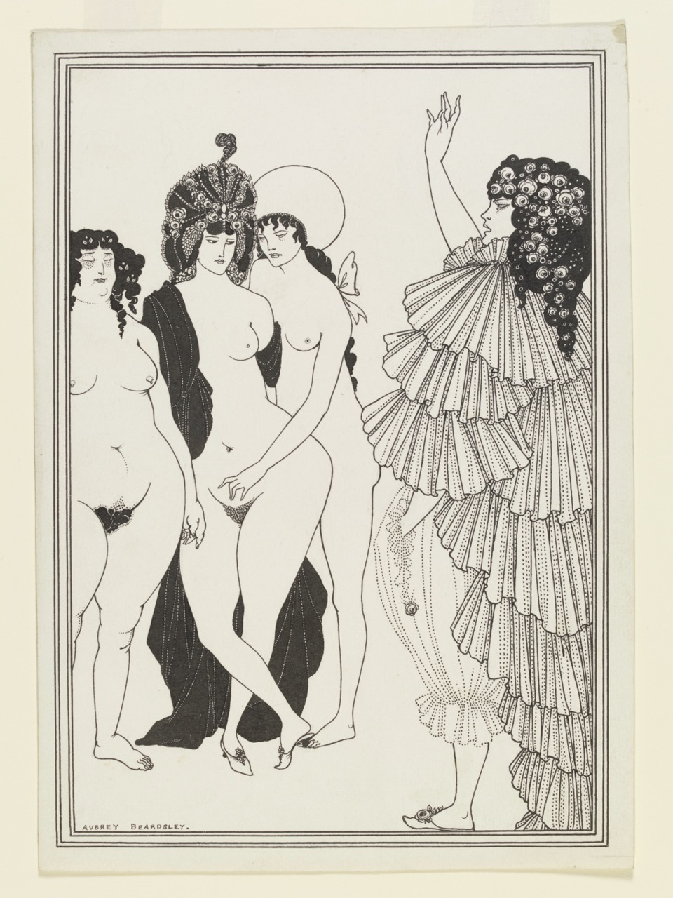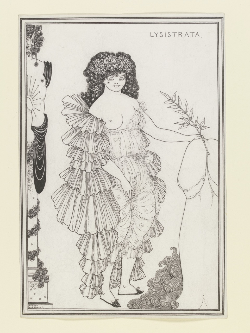 Aubrey Beardsley, Lysistrata Shielding her Coynte, 1896. Ink over graphite on paper, 10 × 6.8 inches. Image courtesy Tate Britain.