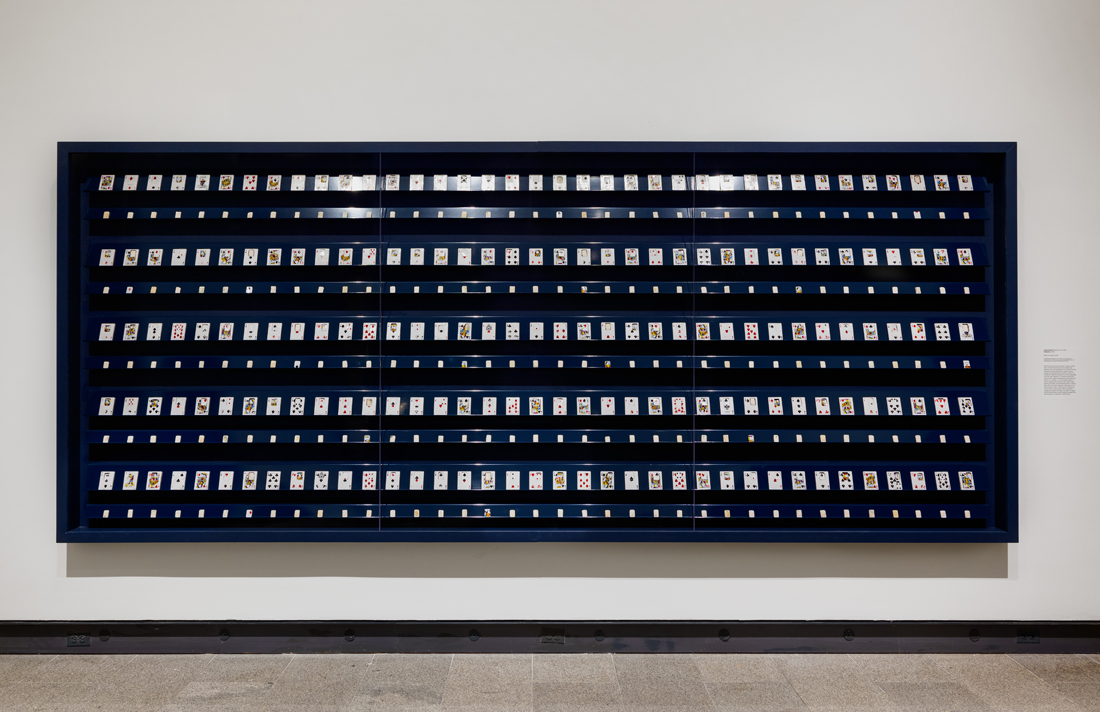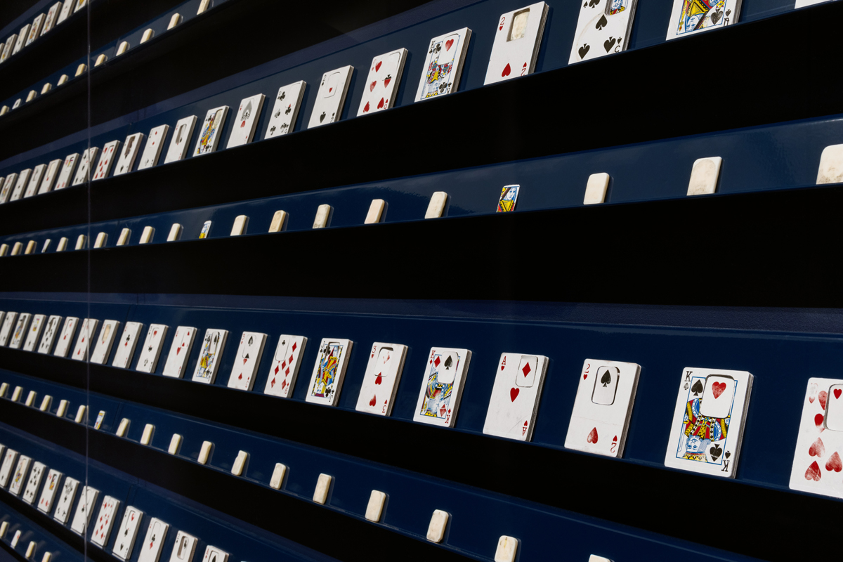 In Purgatory (2009), the earliest work on view, there are five blue-lacquered shelves, each displaying thirty-seven stacked decks of playing cards, the whole behind glass. Every deck is altered with a window-shaped cutout. Some of these windows reveal the suits, numbers, or faces of different cards; other windows reveal off-white surfaces, printed with nearly illegible pictures. In between the rows of cards, smaller shelves of the same dark blue display white domino-size rectangles. The wall text informs us that these dominos are bars of prison-issued soap, and that they serve as inserts in many of the cutouts. Laboring clandestinely in his cell, Krimes had printed images from newspapers and magazines onto the soap, beginning with mugshots from local crime sections and moving on to tabloid shots of famous people. The soap bars invigorate the decks with further meaning: pictures of the accused replace kings and queens; supermodels and presidents animate the deck’s lowest numbers. All of the portraits have faded over time, rendering the subjects—and their varying degrees of criminality and prominence—virtually indistinguishable from one another.