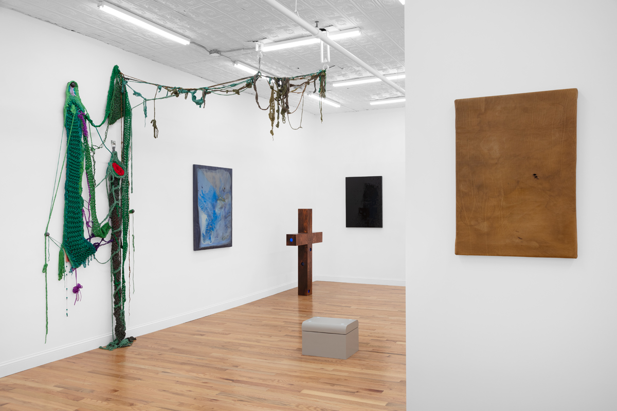 Trauma or loss is invoked most explicitly in two works by Quay Quinn Wolf. For one, the artist has pulled a length of tanned leather taut over stretchers. Stained, cloudy, and creased, its surface nicked and punctured, the pebbled hide’s botanical fragrance—a suggestion of care—counters macabre connotations. (Essential oils are listed as a material.) The skin does not evoke a corpse, but a body marked by inevitable injuries, imperfections, or past violence.