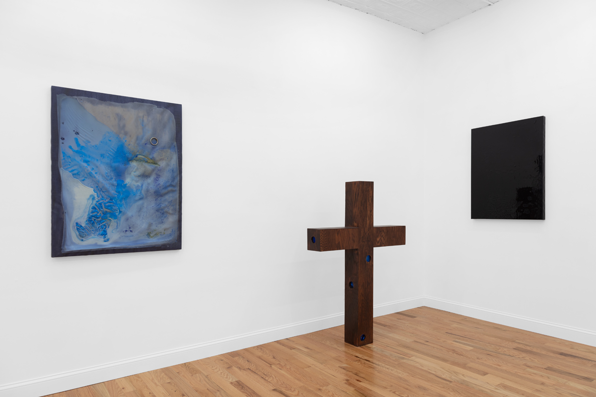 Serendipitous relationships between disparate things seem to occur frequently here, encouraged by evocative or whimsical arrangements. A trio of works, positioned along one wall, are linked by a visual rhyme, each marked by similar-size circles or holes, which lead the eye to connect the dots visually, even if conceptually it can’t quite be done. The mononymous artist Shikeith’s freestanding sculpture, grace comes violently (2022), is a hollow, cross-shaped box of dark-stained plywood with jigsawed orifices. Plugged into the wall with a casually coiled cord, it plays a five-channel video, visible through its peephole apertures. Blue-cast views of bodies, abstracted by close-cropped shots, give the impression of a pulsing interior at odds with the controlled carpentry (and religious significance) of its geometric container.