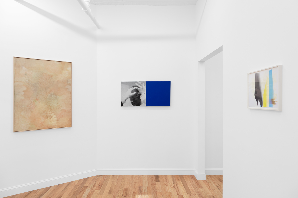 Behind abstract forms, installation view. Courtesy Fragment. Pictured, left to right: Hayden Dunham, winged condensation, 2021; Shikeith, grace comes violently, 2022; Carrie Yamaoka, 40 by 30 (clear/black #3), 2022.