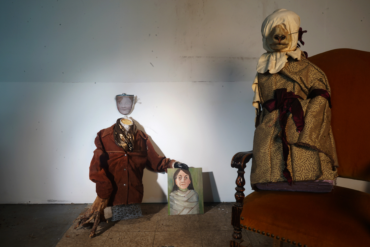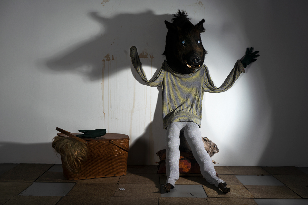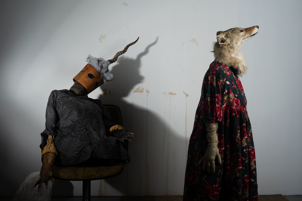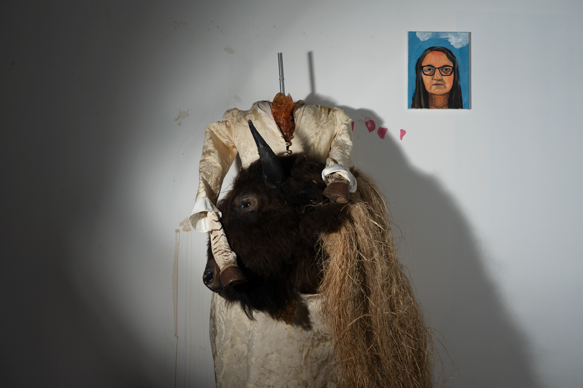 Dead animals, disassembled into pieces, are a heavy presence in Linnaeus After Dark (as the 2022–23 series is titled), despite its sense of play. Whimsy and foreboding cross-fade in the shifting gloom. Hung at a range of eye levels in a wavy line around the compact gallery, the tragicomic interior scenes suggest an improvised mythic world—and a photo shoot of extremely scant resources. I imagine tilted table lamps, or work lights clamped to chairs, their weak beams carefully angled to achieve Pentecost’s range of low-tech effects. Distorted and amplified shadows have an outsize graphic and dramatic power, lending an etheric, metaphysical dimension to her yard sale– or garbage heap–sourced characters and sets. A makeshift staging of a fable, like a children’s play produced in a basement, comes to mind when, for example, in Ritual Evaluation, a bipedal coyote in a floral fast-fashion smock dress turns away from a legless, one-horned, bucket-masked creature slumped in an office chair. Pioneer Cemetery, on the other hand, is more in the spirit of Halloween. A decapitated frontier woman wears a gown of white damask, holding in her arms not a human head but one once attached to a beautiful bison.