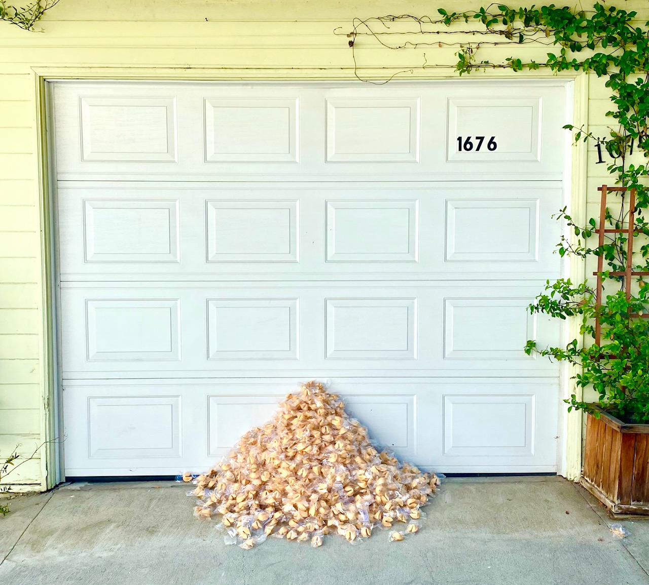 Felix Gonzalez-Torres, “Untitled” (Fortune Cookie Corner), 1990. As installed by Gary Simmons, garage of a friend’s home, Silver Lake, Los Angeles, CA, USA. Photo: Russell Salmon, May 25, 2020.