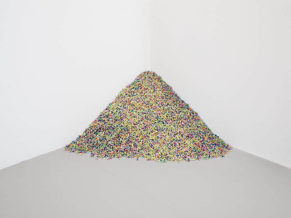 Felix Gonzalez-Torres, “Untitled” (Ross), 1991. Candies in variously colored wrappers, endless supply; overall dimensions vary with installation (ideal weight: 175 pounds). Installation view from The Assassination of Leon Trotsky, David Lewis Gallery, New York, New York, September 16–November 4, 2018. © Felix Gonzalez-Torres. Image courtesy Felix Gonzalez-Torres Foundation.