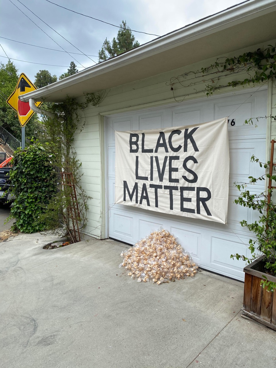I think the artist Gary Simmons is, so far, the winner. Among those who savvily avoided what’s implicitly ridiculous about placing a participatory sculpture in a closed-to-the-public place by selecting a residential sidewalk in Silver Lake, Los Angeles, for his installation, he also added a powerful timestamp. With a simple, perhaps obvious gesture to acknowledge the moment, he provided an intentional context for the Gonzalez-Torres piece, highlighting it not as a blue-chip artwork on loan—which is what a designer chair or a #matthewritchie sculpture seem to do—but as an honest gift. Simmons’s pyramid, pushed against a white single-car garage door, was, by May 31, accompanied by a banner taped above it: JUSTICE FOR GEORGE FLOYD.