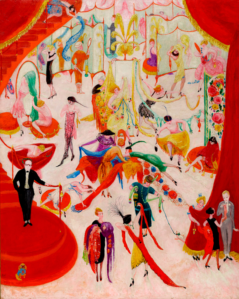 Because her paintings resemble nothing else, and because she lived an unconventional life, there’s a tendency to consider Stettheimer as (merely) an eccentric, and to mistake the stridently decorative (one might say feminine) quality of her work for, if not frivolity or hobbyism, a cultivated obliviousness, reclusiveness, or outsider stance. Bloemink counters a number of myths and misconceptions (many of them originating in a fanciful 1963 biography by film critic Parker Tyler), seeing in Stettheimer’s mature style an insider’s calculated rejection of prevailing modes of both figuration and abstraction—as well as a stunning abandonment of the concerns of painting as a discrete medium—in favor of the experiential ideal of the Gesamtkunstwerk. Noting the artist’s ecstatic reception, as a young woman in Paris, of a performance by Sergei Diaghilev’s Ballets Russes—the profound impression left by its radical elevation of the applied arts through its innovative set and costume design—Bloemink explains that Stettheimer’s large-scale paintings were conceived of as “captured moments of theatrical productions.” Beginning in 1917 or so, “figures animate the space, caught in the midst of moving and gesturing,” the author writes. “Pure colors, often directly out of the tube, reflect emotional moods and ambient temperatures, while images of instruments and musicians imply sounds.”