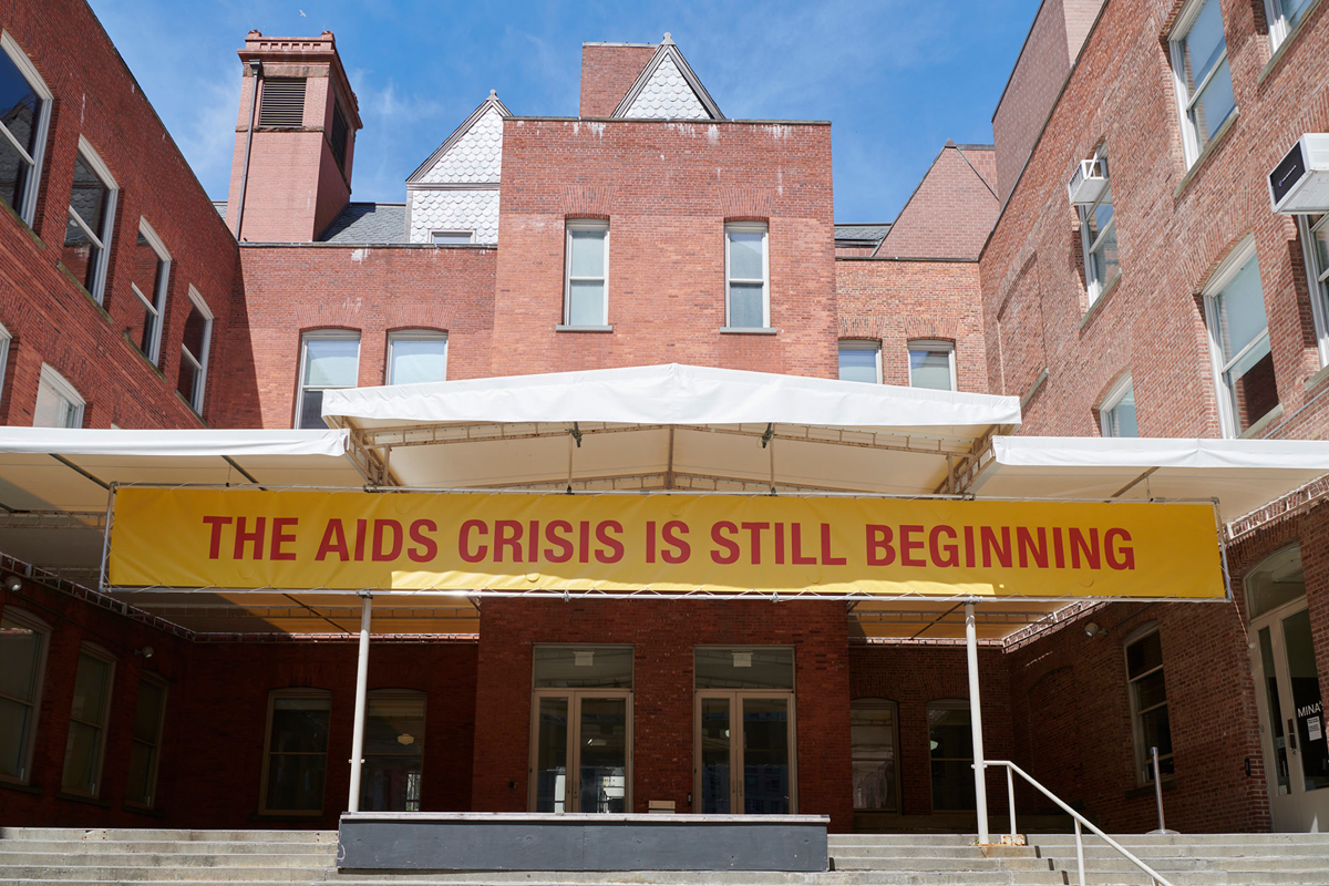 Another kind of blazing rupture greets visitors to Bordowitz’s retrospective—or anti-retrospective—at MoMA PS1. Titled I Wanna Be Well, after the Ramones song, the exhibition begins outside. A hazard tape–yellow banner, printed with crimson text, hangs above the museum’s main entrance, a blaring addition to the façade that reads “THE AIDS CRISIS IS STILL BEGINNING.”