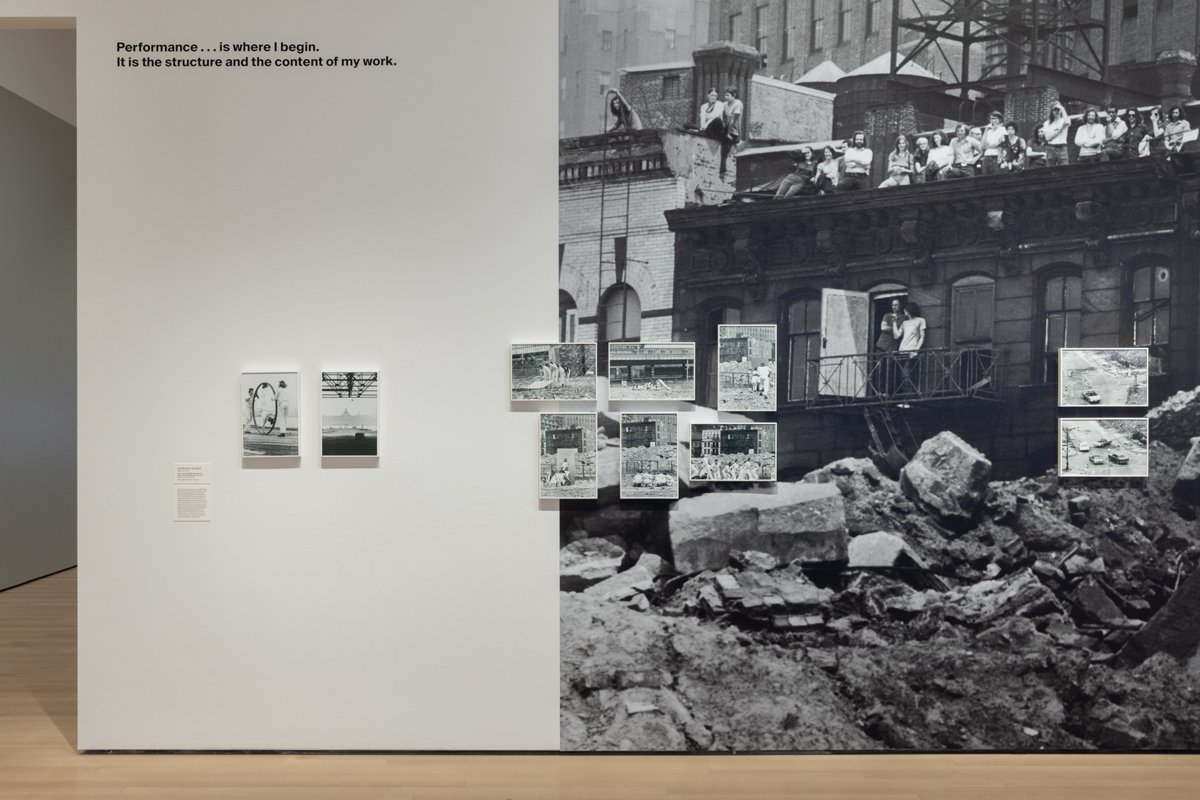 Joan Jonas: Good Night Good Morning, installation view. Courtesy Museum of Modern Art. Photo: Jonathan Dorado. Pictured, Peter Moore, Joan Jonas, Delay Delay performance views, Lower West Side, New York, 1972.