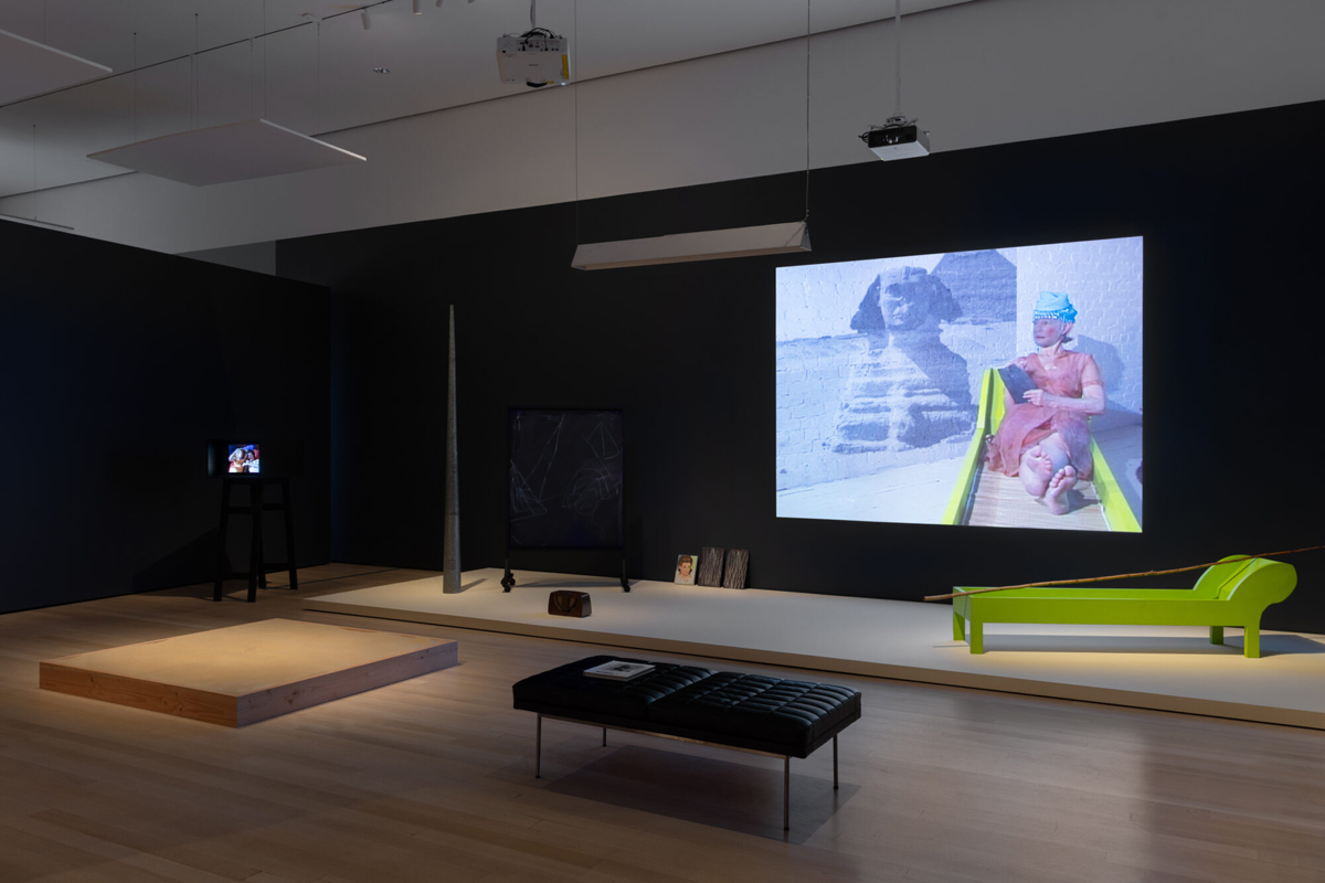 The moody and spectacular Mirage (1976/1994/2005/2019) is a case study in Jonas’s ability to reimagine her work according to its venue and its moment. Conceived initially as a theater piece, it exists here as a stunning arrangement of obliquely connected videos, drawings, and poetic objects (a small forest of tall cones and footage of an erupting volcano are among its components). The constellation of elements that form Lines in the Sand (2002)—whose title references George Bush’s rhetoric before his invasion of Iraq—appears as a surreal gameboard. A sandbox and rake, a giant drawing of a ziggurat, and a lime-green version of Freud’s couch accompany a video in which the poet H. D.’s reimagining of Helen in Troy is transposed on the Luxor Hotel in Las Vegas. Documentation of Jonas’s activation of the set is offered but almost unneeded—it’s implied.