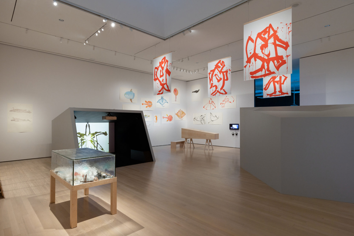 In the 1990s, her interest in evoking performance (without live performers) resulted in her My New Theater works—portable, diorama- or camera obscura–like sculptures to house film projections. When similar enclosures appear (creeping back up in size) within the expansive presentation of her Moving Off the Land series—a lush paean to biodiversity initiated in 2016—two of them, like miniature cinemas, contain seating. Within a bright gallery hung with both careful and slapdash drawings of ocean creatures, the black-painted boxes invite viewers to join (or occlude) Jonas’s videos-within-videos—underwater wildlife scenes layered with human speech and action. In one moment, children move mirrored cardboard rectangles around, fragmenting and distorting a projection of a school of fish. Their silvery props are placed in a line against a wall, a reminder of how Jonas’s journey is one of constant circling back.