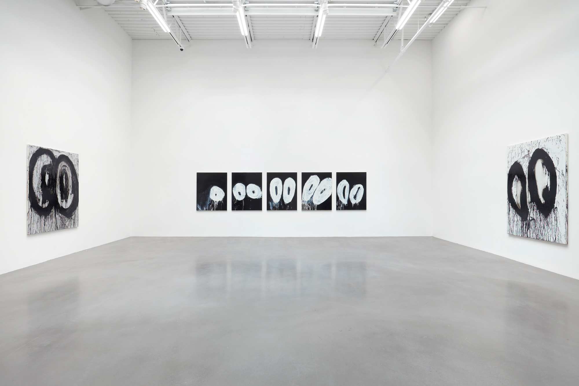 Joyce Pensato: Fuggetabout It (Redux), installation view. Courtesy Joyce Pensato Estate and Petzel. Photo: Thomas Mueller. Pictured, left to right: Who Killed Kenny?, 2012; What’s Next, 2015; Eyes Wide Open, 2016.