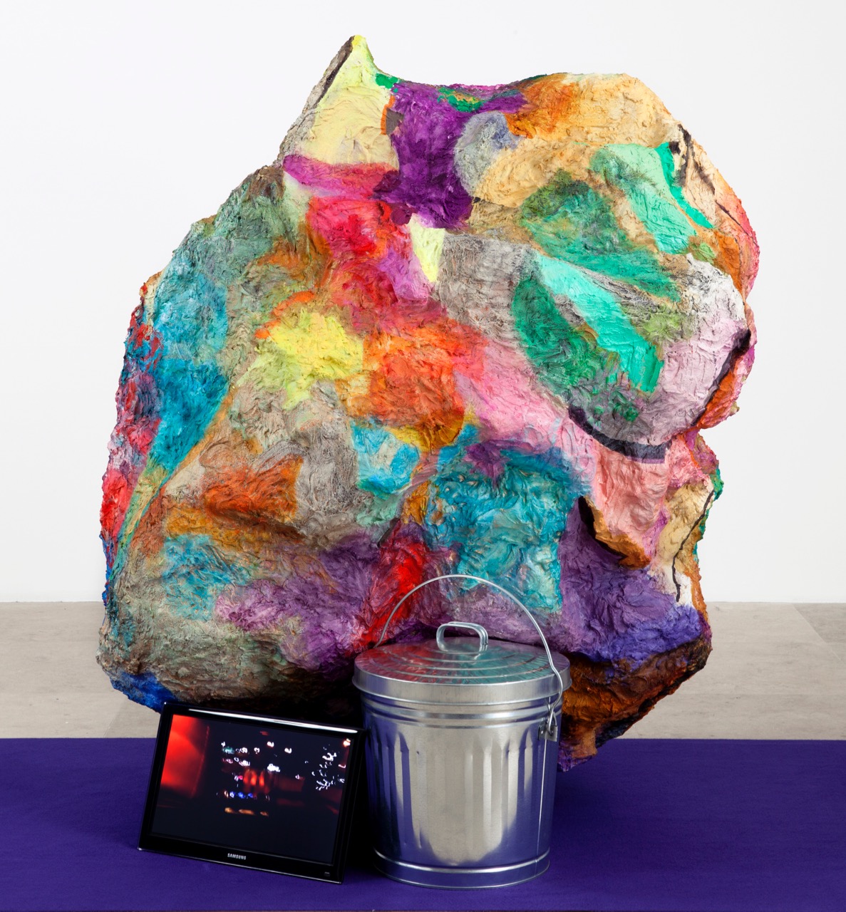 Rachel Harrison, Hoarders, 2012. Wood, polystyrene, chicken wire, cement, cardboard, acrylic, metal pail, flat screen monitor, wireless headphones, runway carpet; and Hoarders Video, digital video, color, sound, 10:39 minutes (2012). Overall dimensions variable. Sculpture: 61 × 47 × 45 inches. Courtesy the artist and Greene Naftali, New York. Photo: John Berens.