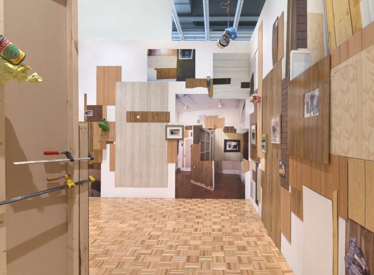 Rachel Harrison Life Hack, installation view. Pictured: Should home windows or shutters be required to withstand a direct hit from an eight-foot-long two-by-four shot from a cannon at 34 miles an hour, without creating a hole big enough to let through a three-inch sphere?, 1996 / 2019. Photo: Ron Amstutz.