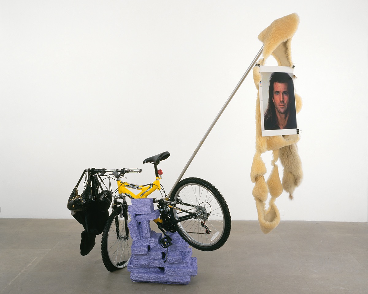 Before long, Harrison’s stroll down memory lane becomes a literal map to wander, in an installation reminiscent of the stark set for Lars von Trier’s Dogville: gray lines and stenciled street names on a black plywood floor plot space for her sculptures. This stylish framing heightens the satirical/salutary resemblance of her cobbled-together constructions to public monuments, each one remarkable for the economical double function of its constituent parts as structural elements and cultural references. Huffy Howler (2004), named for the bike at its center, is skewered by a metal pole; binder clips attach a headshot of a young Mel Gibson to the sheepskin pelts hanging from its end. While Gibson’s image might now bring to mind any number of roles or DUI arrests, in 2004 he made news for directing The Passion of the Christ, controversial for its graphic depiction of torture and crucifixion in addition to its anti-Semitism. In the ridiculous, poignant Huffy, he appears as a cult leader or political candidate championed (or abandoned) by the bike’s absent rider. Viewed from another angle, his portrait might be seen as a convenient placeholder for a head in a slapdash work of abstract figuration—a man charging at you on horseback, maybe.