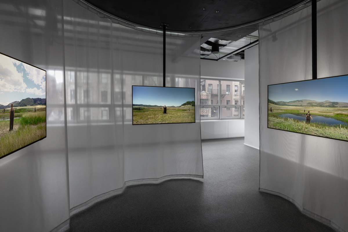 Raven Chacon: A Worm’s Eye View from a Bird’s Beak, installation view. Courtesy Swiss Institute. Photo: Daniel Pérez. Pictured: For Four (Caldera), 2024. Four-channel video and audio.