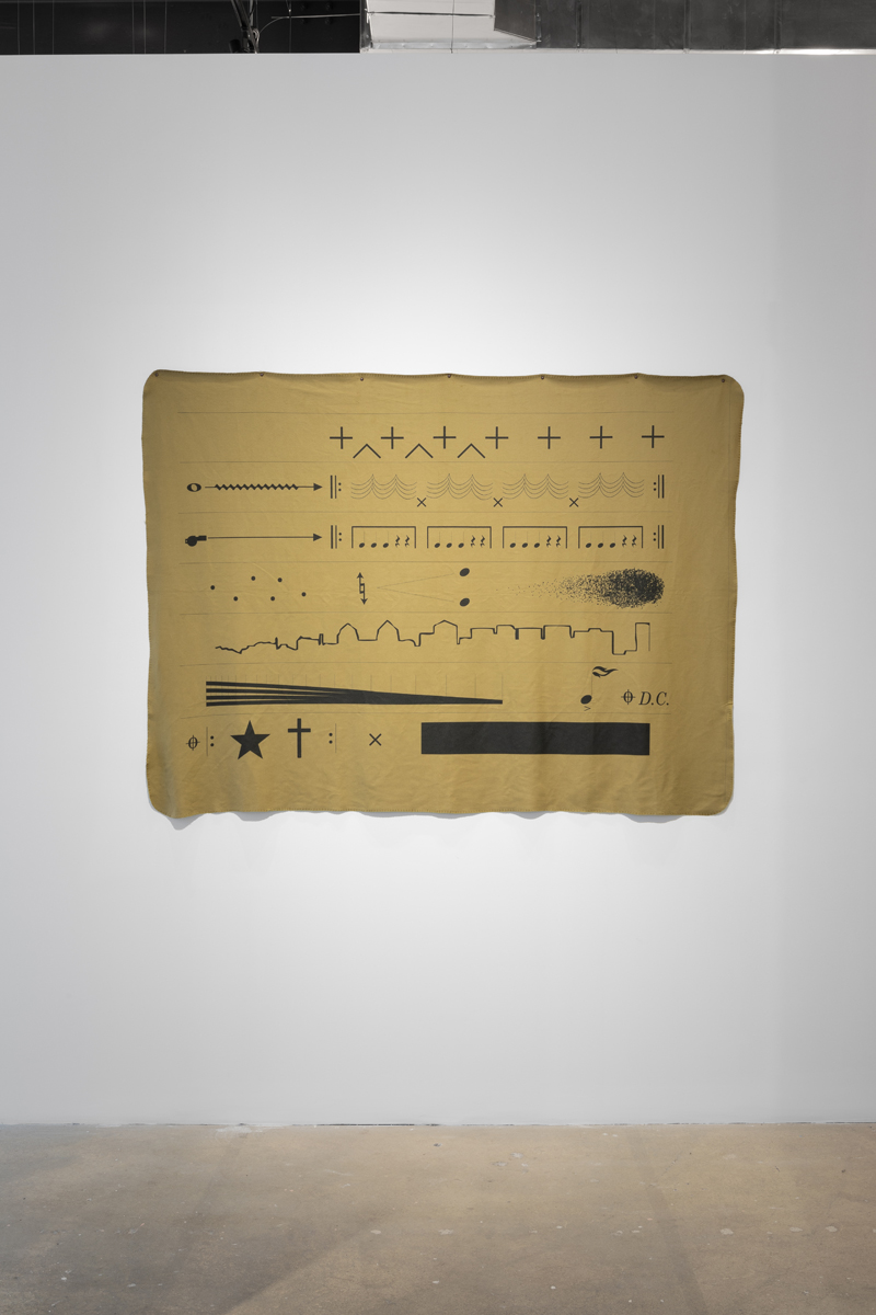 Raven Chacon: A Worm’s Eye View from a Bird’s Beak, installation view. Courtesy Swiss Institute. Photo: Daniel Pérez. Pictured: American Ledger No. 1 (Army Blanket), 2020. Score for performance, unique army blanket, and digital print.