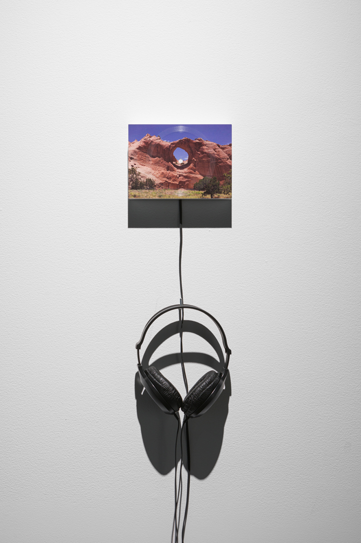 Raven Chacon: A Worm’s Eye View from a Bird’s Beak, installation view. Courtesy Swiss Institute. Photo: Daniel Pérez. Pictured: Field Recordings (Window Rock, 4:00am), 1999. Audio, headphones, and flexi disc.