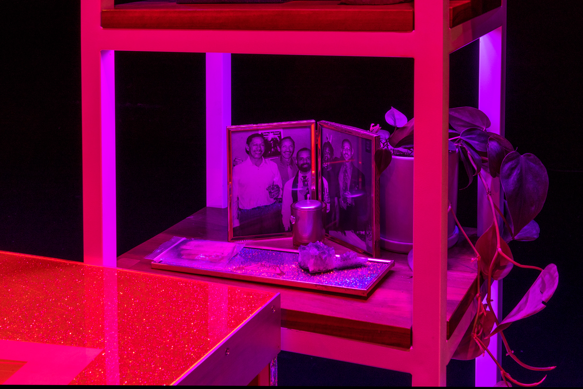 In the darkness of the Kitchen’s cavernous main space, curved planes of laminated glitter form the horseshoe-shaped island of Sadie Barnette’s installation, The New Eagle Creek Saloon. Surrounded by barstools, the reflective structure seems to levitate a little—thanks to the glow of hidden purple LED striplights and the visual pull of a pink neon sign that crowns the archway of open shelves at the back. The illuminated bubble script reads “Eagle Creek.” The artist’s sculptural invocation of the first Black-owned gay bar in San Francisco—which her father Rodney Barnette opened in 1990 and operated until 1993—is stylized, abstracted. (The historic establishment featured a bar of dark wood, and while it had a neon sign, it wasn’t pink.) Her version looks less like the excised core of a real nightclub than a phantasmic projection, a metaphysical representation, or a small spacecraft—especially when a DJ takes the place of bartender at the helm, performing in the round.