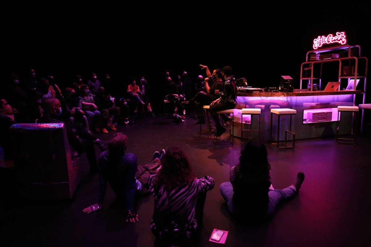 Sadie Barnette: The New Eagle Creek Saloon, installation view. Pictured, Shaun J. Wright, Saturday Sessions event, 2022. Courtesy the Kitchen. Photo: Paula Court.