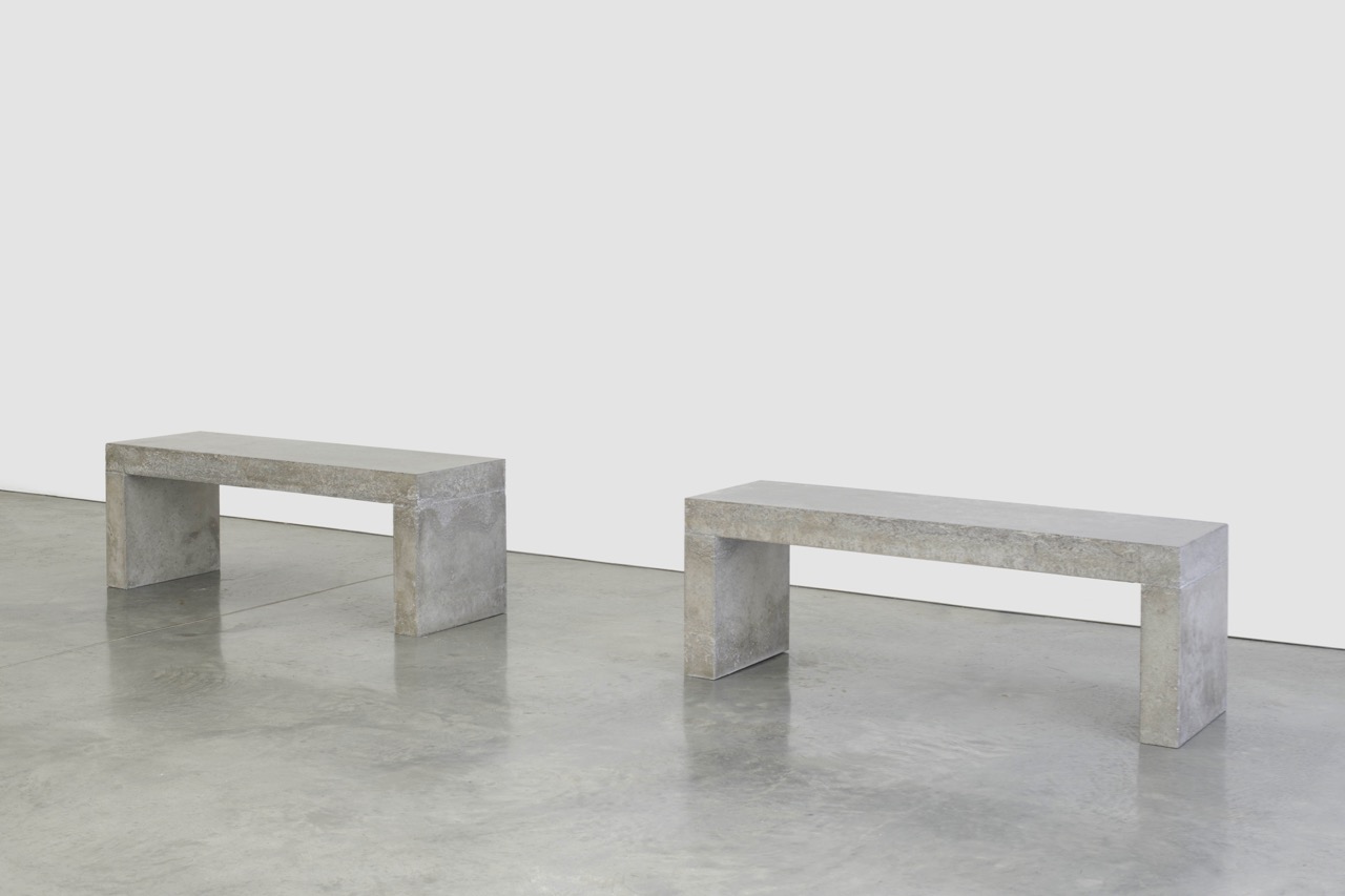 Teresa Margolles, Dos bancos, 2020. Two benches made from a mixture of cement and material sourced from the ground where the body fell of a person shot dead at the northern Mexican border, each 19 3/4 × 17 3/4 × 55 1/8 inches. © Teresa Margolles 2020. Image courtesy the artist and James Cohan. Photo: Phoebe d’Heurle.