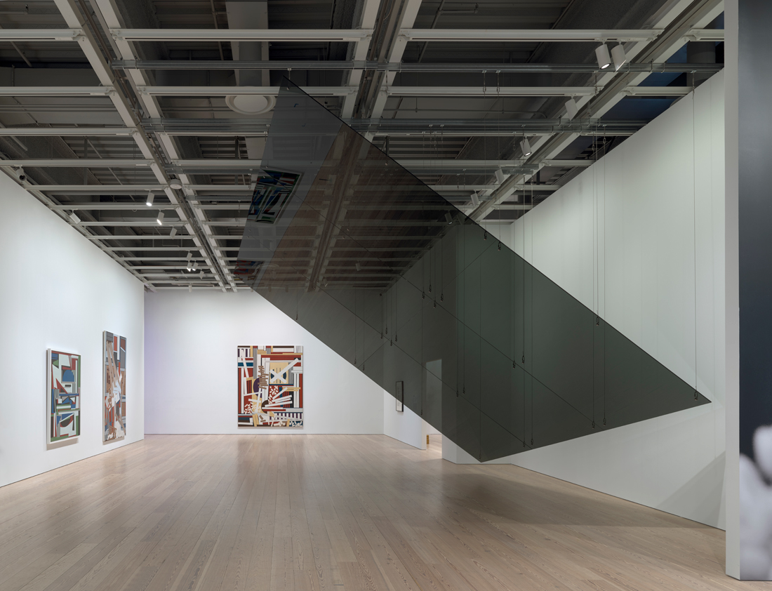 Another intergenerational encounter, whose connection is more visual and associative, is staged on the fifth floor. A dramatic architectural intervention, a transparent, angled canopy—like a menacing “glass ceiling”—by Charisse Pearlina Weston, born in 1988, echoes the hard-edge diagonals of an adjacent suite of towering, knockout paintings from the 1960s and ’70s by Mavis Pusey, a Jamaican-born abstractionist who died in 2019 at age ninety without the recognition she deserved. (A wall label notes she was included in a Whitney exhibition of Black artists in 1971, which artists protested for its white curatorial perspective.)