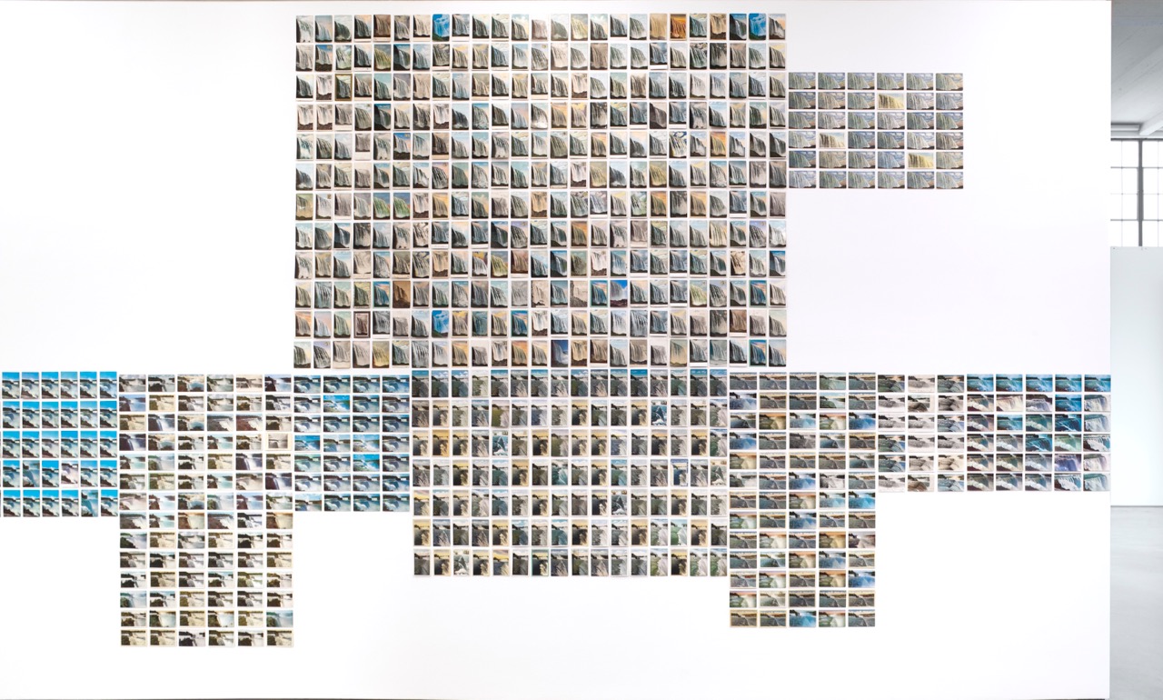 Leonard’s uncanny ability to find the pulse of a cliché, the sublime core of a generic subject, crests in works composed of mass-produced postcards, notably those found in the nearly thirteen-foot high, mosaic-like arrangement You see I am here after all (2008). In it, 3,883 pictures of Niagara Falls—worn, discolored, and emblazoned with faded-script tidings from another era—are grouped by vantage point and affixed to the wall. With this refracted, atomized, but also collective, representation of the natural wonder and once-upon-a-time honeymoon capital, it regains majesty as a cultural construction, a mythic rather than hackneyed site of popular imagination, now in the grand light-flooded space of the museum.
