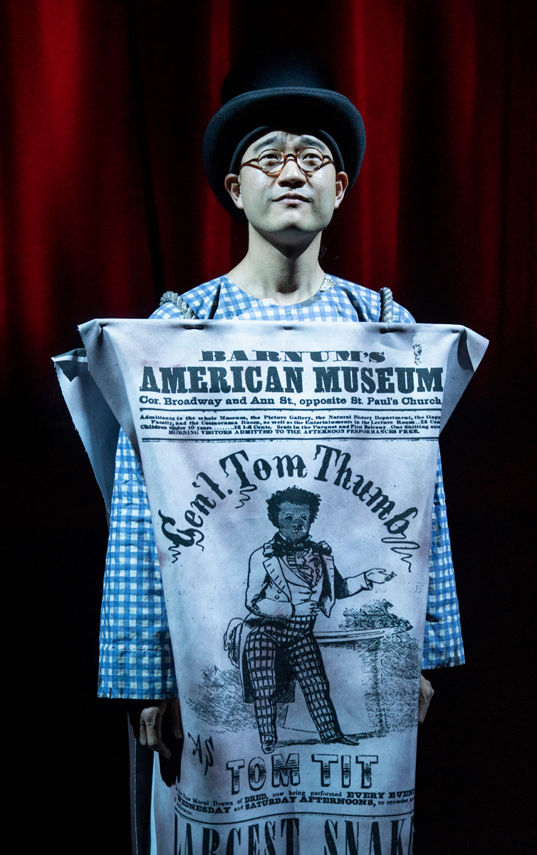 For all the poetic liberties it will take, the play maintains a kite line to the historical record. (I say this advisedly; we do not know a great deal about the real Moy, and much of what we do know comes fifth-hand. As one character reflects, “She is like a wisp, a memory, an idea, a poem.”) As in the play, Moy, who was born in Guangzhou Province, was sold by her father in 1834 to two brothers—Frederick and Nathaniel Carnes, of Salem, Massachusetts—as part of a ploy to market Eastern wares to Americans via an exoticized fantasy of China. They exhibit her as a “curiosity” in Philadelphia’s Peale’s Museum for the delight and edification of its visitors. Theatrical impresario P. T. Barnum would take custodianship of her in 1847, billing her as the “only Chinese Lady that ever left the walls of Canton.” At the height of her iconicity, she drew up to two hundred visitors a day.