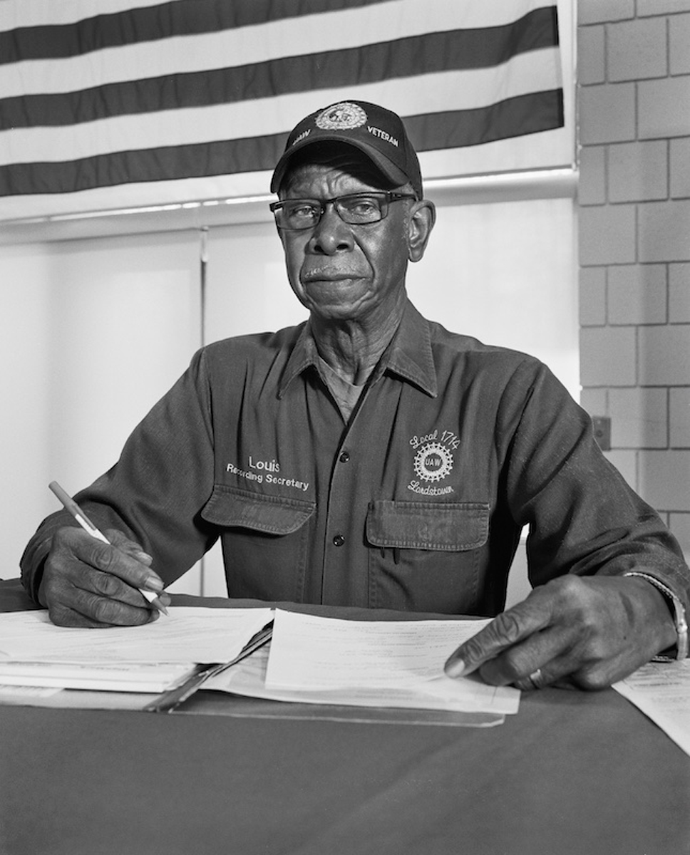 LaToya Ruby Frazier, Louis Robinson, Jr., UAW Local 1714, (34 years in at GM Lordstown Complex, die setter), Recording Secretary, at UAW Local 1112 Reuther Scandy Alli union hall, Lordstown, OH from The Last Cruze, 2019. Courtesy the artist and Gladstone gallery. © LaToya Ruby Frazier.