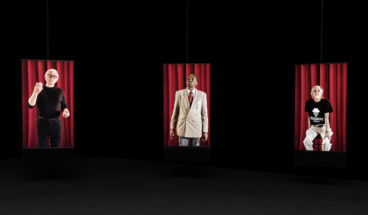 Candice Breitz, I’m Your Man (A Portrait of Leonard Cohen), 2017 (installation view, detail). 19-channel video installation, color with sound, 40 minutes, 43 seconds, featured on 18 suspended monitors and 1 single-screen projection. Photo: Guy L’Heureux.