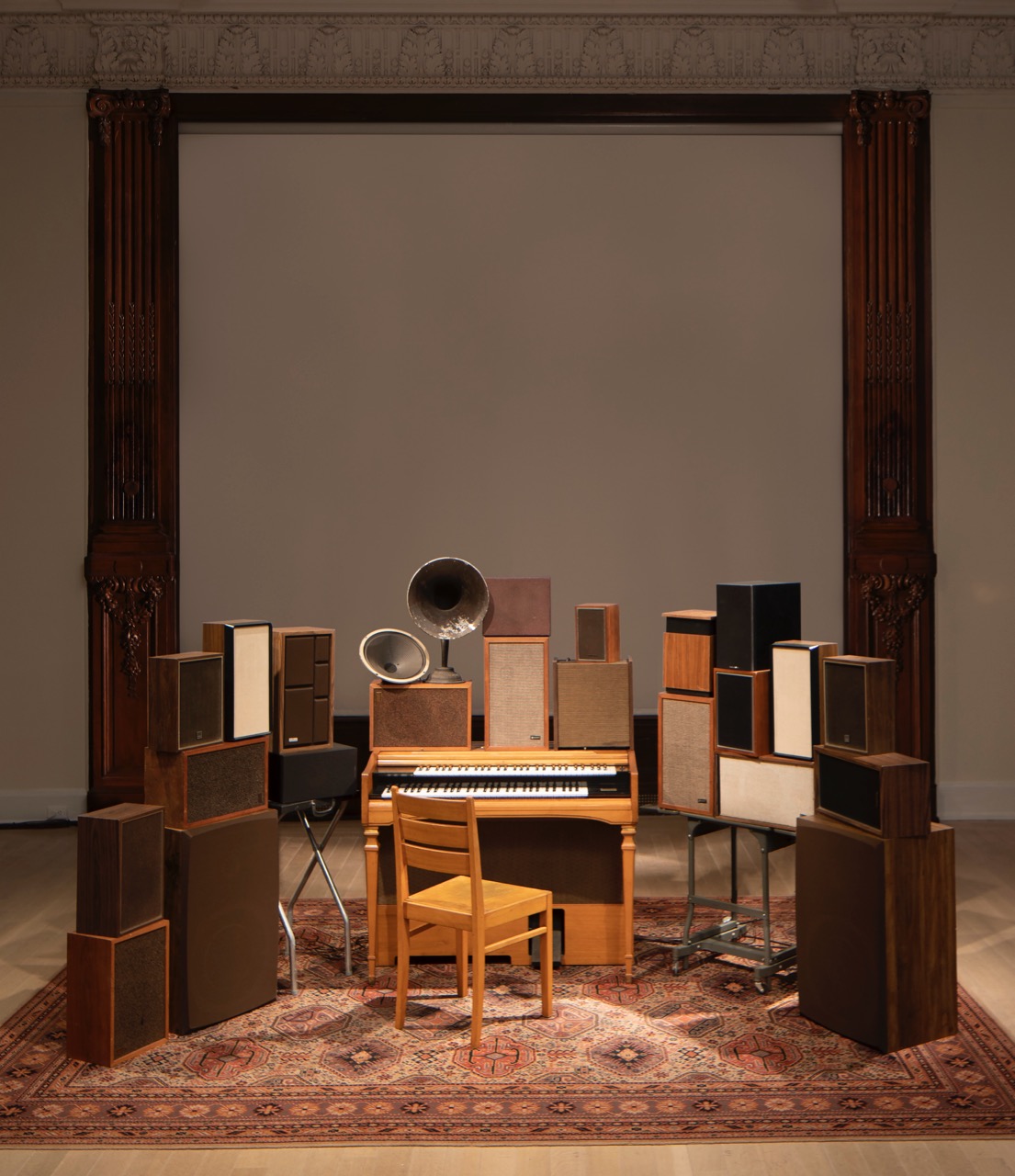 Janet Cardiff and George Bures Miller, The Poetry Machine, 2017 (installation view). Interactive audio / mixed-media installation including organ, speakers, carpet, computer, and electronics. Image courtesy the artists, Luhring Augustine, Fraenkel Gallery, and Gallery Koyanagi. Photo: © Frederick Charles.