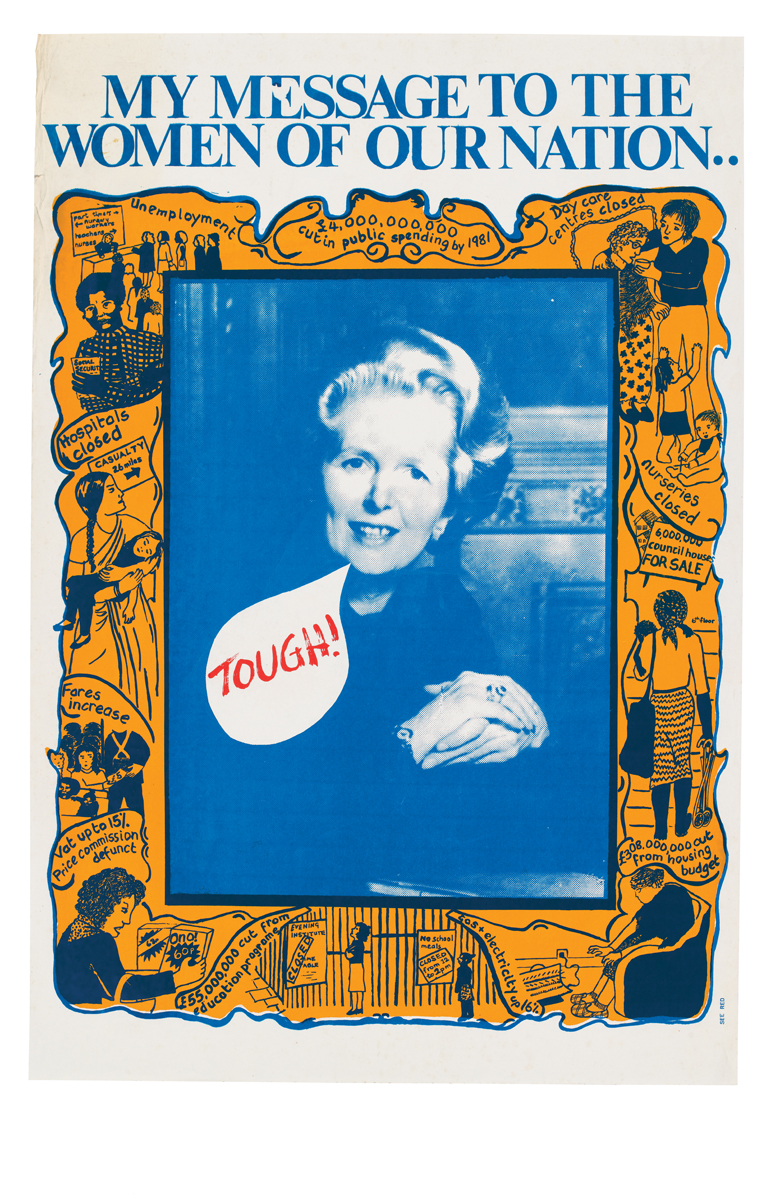 The period the exhibition covers is not a distant past. There isn’t much curatorial explanation of the focus on the two decades in question, though that era’s politics, especially the eleven years of Margaret Thatcher’s rule, define the UK to this day. The See Red Women’s Workshop poster Tough! (1979) has a speech bubble with that word coming out of the mouth of then-newly elected Prime Minister Margaret Thatcher, surrounded by a frame detailing how Thatcher’s policies, from cutting millions in public spending to closing day-care centers, harmed women. It’s an official poster the collective repurposed: they wrote to Thatcher’s office asking for a portrait, and one was unsuspectingly sent to them; Thatcher’s staffers must have thought a feminist group wanted to commend the first female Prime Minister, who was famous for sayings like “there’s no such thing as society” (in an interview for glossy magazine Woman’s Own in 1987) and “there is no alternative”—to capitalism, that is. Seen today, in a country that has lived under a conservative government’s austerity measures for over a decade, it’s a great reminder of the Thatcher fallacy: the idea that a female head of state would be good for women (or for that nonexistent thing, society) by virtue of being a woman.