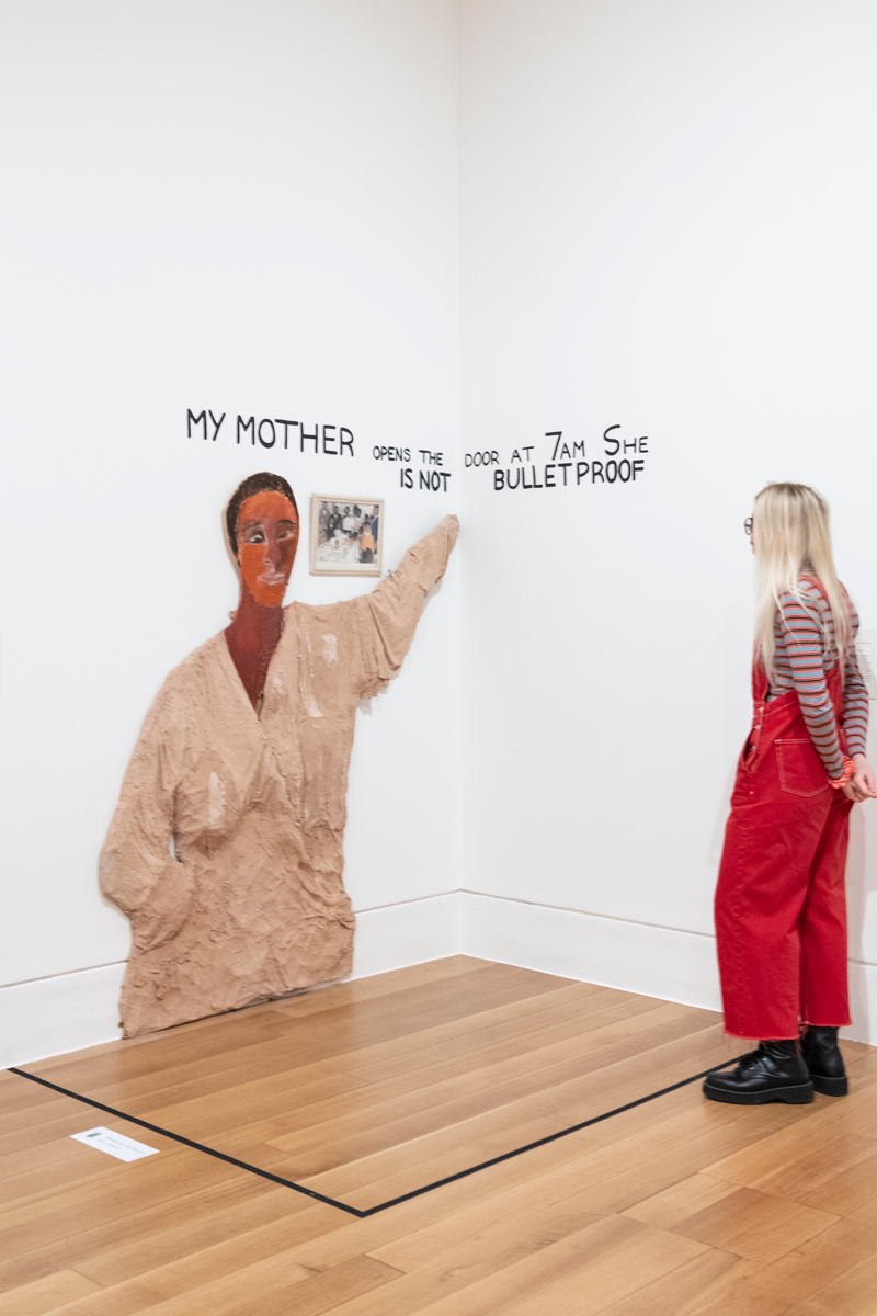 Direct responses to the politics of the period appear throughout. The 1980s sections are dedicated to events in the UK from Princess Diana’s 1981 marriage to Prince Charles (don’t do it, Di!—the royal wedding and its celebration of power and family norms was a slap in the face for the many women working for gender equality and liberation) to the miners’ strike in 1984–85. A big banner by Thalia Campbell (Thatcher’s Thugs, 1984) shows a riot police officer in Orgreave, the coal mine forever associated with Thatcher’s forceful suppression of the strike. Poignantly, in the next room—dedicated to the feminist members of the British Black Art Movement, founded in the early ’80s—is another representation of police violence. Marlene Smith’s Good Housekeeping III (1985/2023) is a portrait of Dorothy Cherry Groce, shot at home by police officers in Brixton in 1985 during a raid searching for her son. Made of chipboard, plaster, and cloth, it shows Groce next to an old family photo. Written on the wall is the sentence, “My mother opens the door at 7am. She is not bulletproof.”