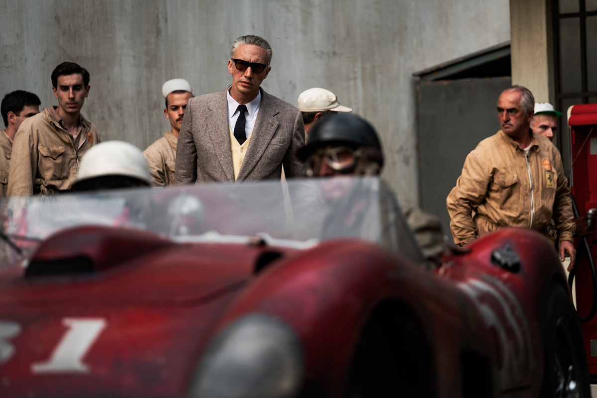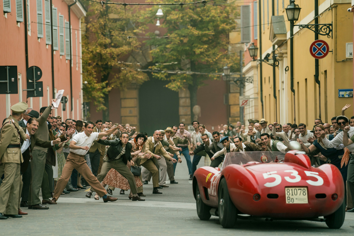 True to form, Mann approaches this material with an obsessive attention to detail to match Il Commendatore and his team’s “brutal determination to win.” The Ferraris themselves—the cars, that is, not the people—were hand-built from 3D scans of the original models, and the races (and especially the crashes) are meticulously re-created in all their gruesome particulars. The Modena of the late 1950s, including every last detail of wardrobe and setting, is simulated with a similar fussiness: from Enzo’s uniform black shades and immaculate gray suits down to the gothic bizarrerie of Laura’s wallpaper. It’s a similar fealty to historical precision that Mann brought to previous period pieces like The Insider and Ali, one that’s sometimes so conspicuous as to feel almost uncanny.