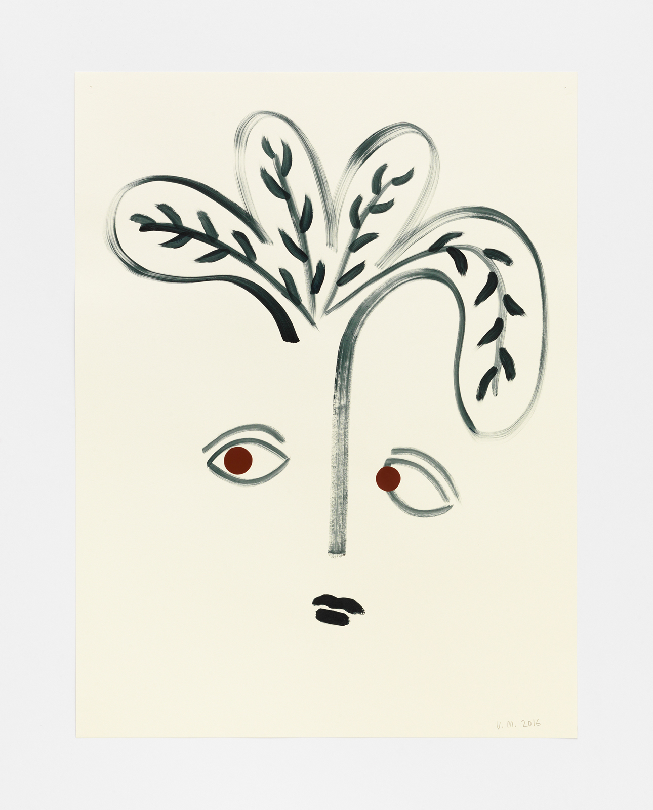 Müller’s work both turns subtlety into an issue and dispenses with it: her game does not involve making life difficult for the viewer, but rather in asking us to examine what we want from subtlety, from nuance, from undecidability. One of the signal themes of the show is the bouquet, and indeed it was an earlier enamel painting of a vase topped by three balls—blossoms in black, red, and light green, signified simply by circles—that seems to have tipped her trajectory from a confrontation between abstraction and figuration into something more complicated. In her enamel paintings, at play is the magnetism, the dynamic between this-and-that. We see it through the vertical bisection of many of the enamel rectangles: this play of a curve that could be a breast except that then, two paintings away, it rotates into a diagonally tilted, curve-edged rectangle. When she moves onto paper, the modality is no longer a set of mechanisms: of tilt, fold-and-double, slot-in-different-colors. Instead it is a question of where that “ambiguity” leads us; what kinds of anxieties are produced by a “figurative” reading, by seeing a face or a bouquet? In the painting on paper Bouquet des Fleurs, the figure is explicitly coy or charming, its worried eyes glancing sideways as a bouquet of leaves grows from its nose, and we are reminded of where modernism was when it shunted expressivity for purer forms.